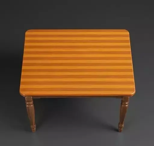 This 3D model presents a classic rustic wooden table, ideal for dining or as a versatile piece of furniture in a cozy interior setting. The table features a rectangular tabletop with a warm, natural wood grain finish, composed of clearly defined planks. The sturdy legs are turned and tapered, showcasing a traditional design with carved details, and appear to have a darker, possibly stained finish that contrasts slightly with the tabletop. The overall aesthetic suggests durability and timeless appeal, making it suitable for farmhouse, traditional, or even eclectic interior visualizations, architectural renders, or virtual staging projects.