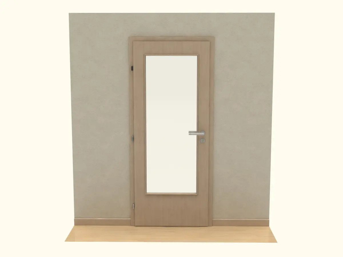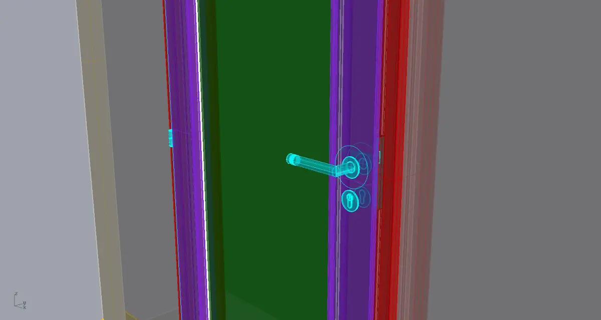 Here you will find wooden door. Modelled with fittings, lock and handle to be able be positioned opened. Rotation axis is at hinges.