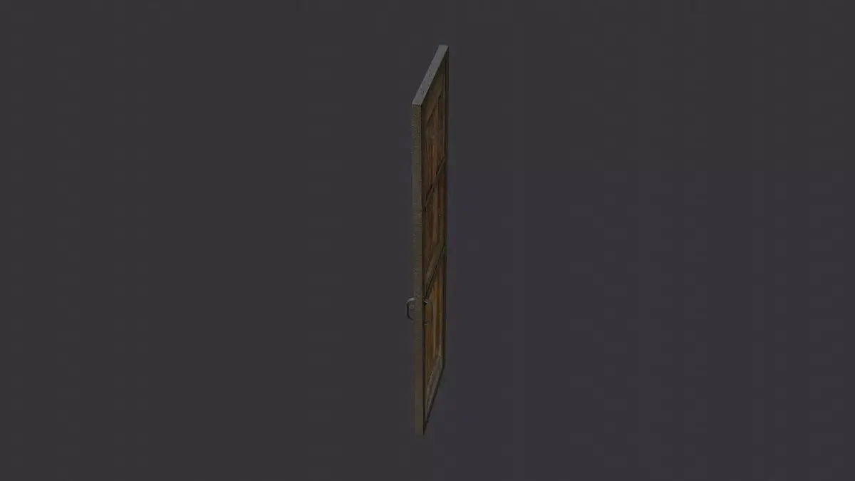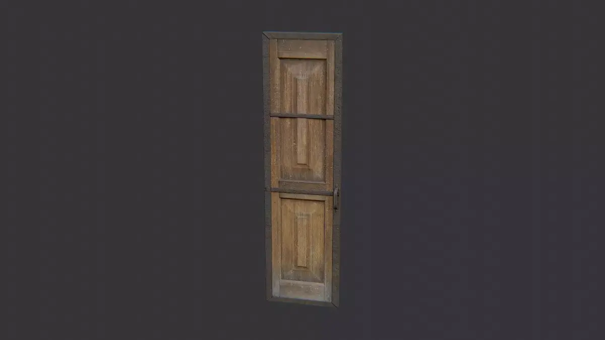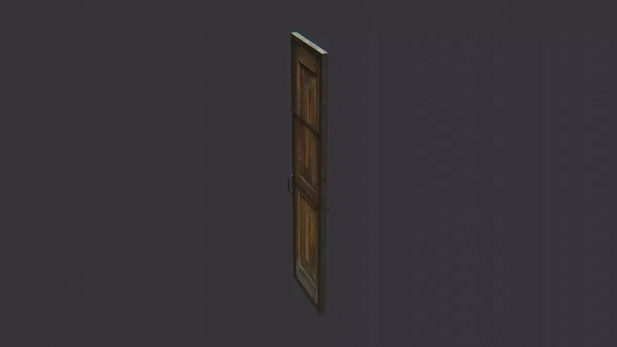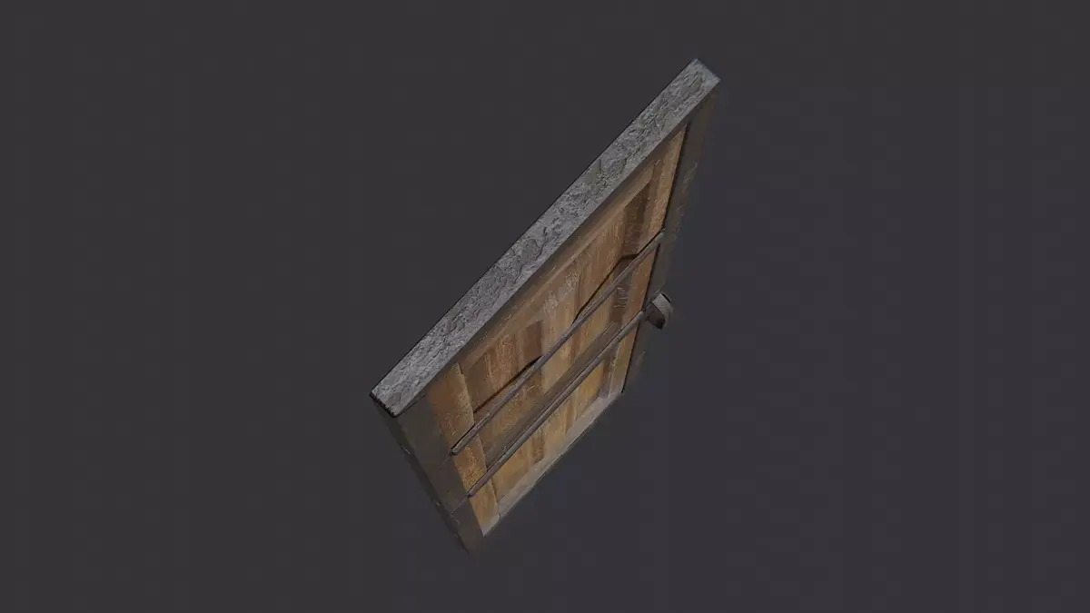 A weathered wooden door with a rustic two panel design and a reinforced metal frame. This asset uses two textures for wood and metal, with clean UVs for easy shading. Ideal for interior halls or industrial exteriors in rustic, medieval, or workshop scenes. Durable and versatile.