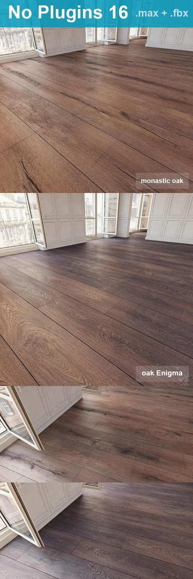 Model, textures and materials of two types of flooring. Designed WITHOUT PLUGINS Archive contains high quality wood texture, a resolution of the board more than 2000 pixels . Formats inside: .max2011 .max2014 .FBX .mtl Files with ready TILED floor.