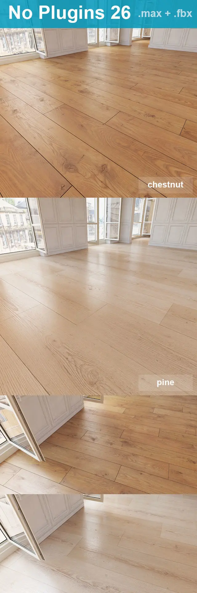 Model, textures and materials of two types of flooring.Designed WITHOUT PLUGINS Archive contains high quality wood texture, a resolution of the board more than 2000 pixels . Formats inside:.max2011.max2014.FBX.mtlFiles with ready TILED floor.