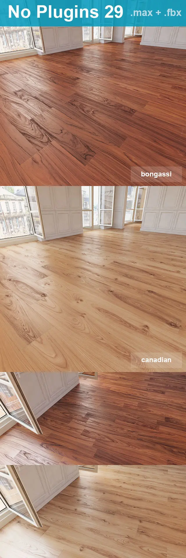 Model, textures and materials of two types of flooring.Designed WITHOUT PLUGINS Archive contains high quality wood texture, a resolution of the board more than 2000 pixels . Formats inside:.max2011.max2014.FBX.mtlFiles with ready TILED floor.