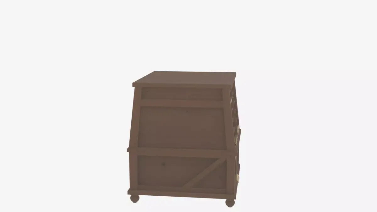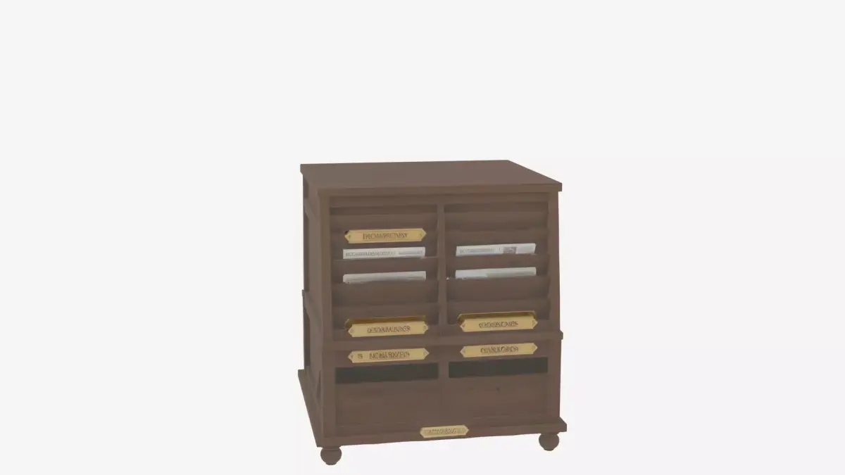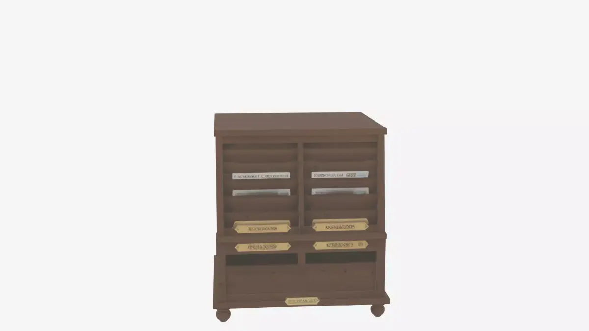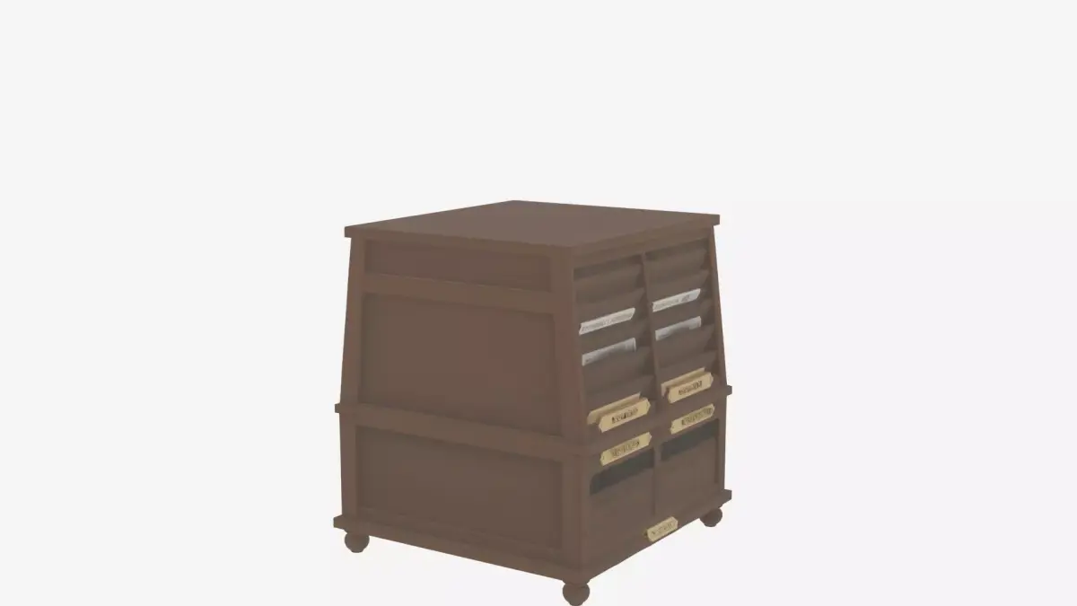 Create a detailed 3D model of a classic wooden bank lobby newspaper holder with multiple newspaper slots and brass label plates. The model should be a floor-standing frame with magazine compartments for reading materials. Render from four angles on a white background: front view showing the multiple slots and brass label plates clearly, back view revealing the sturdy frame construction and stability features, left side perspective illustrating the holder's depth and evenly spaced slots, and right side highlighting the rich wood grain texture and elegant brass accents. This model is essential for period-appropriate 3D reception furniture in games or animations.