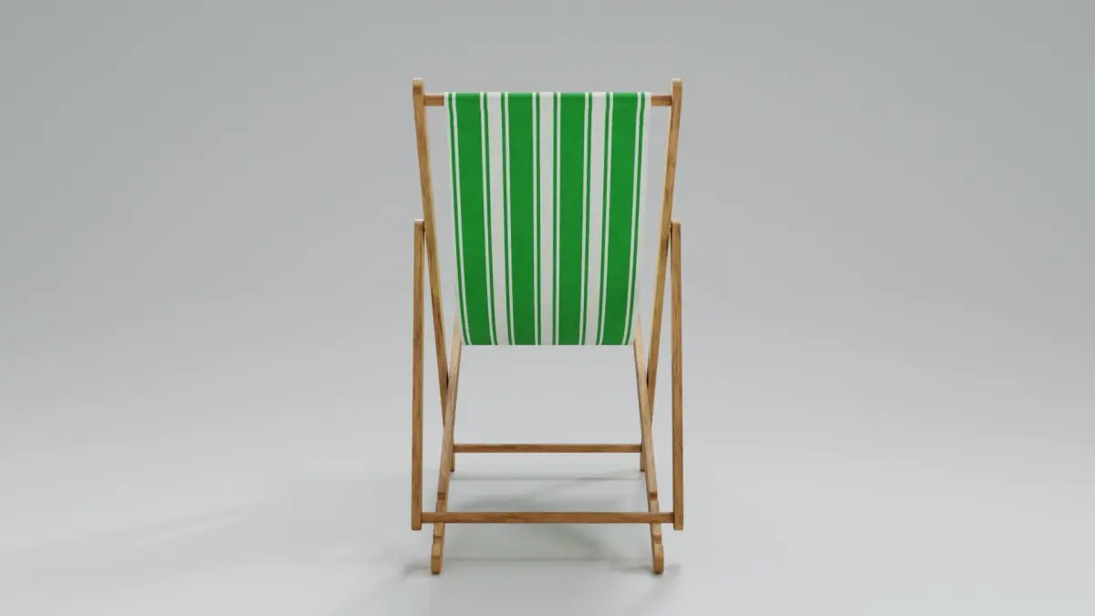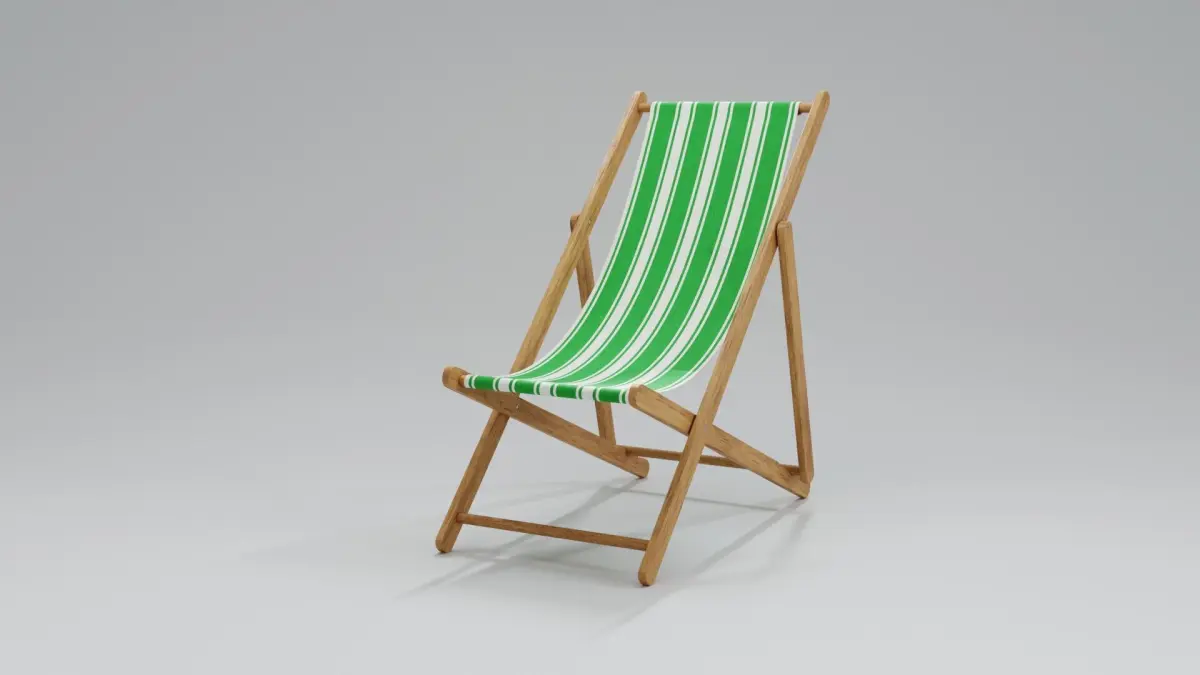 This high-quality 3D model features a Wooden Folding Beach Chair with a classic white and green striped fabric seat. Designed to reflect a timeless coastal aesthetic, this beach chair is perfect for summer-themed visualizations, outdoor furniture scenes, vacation ads, or seaside architectural renders.