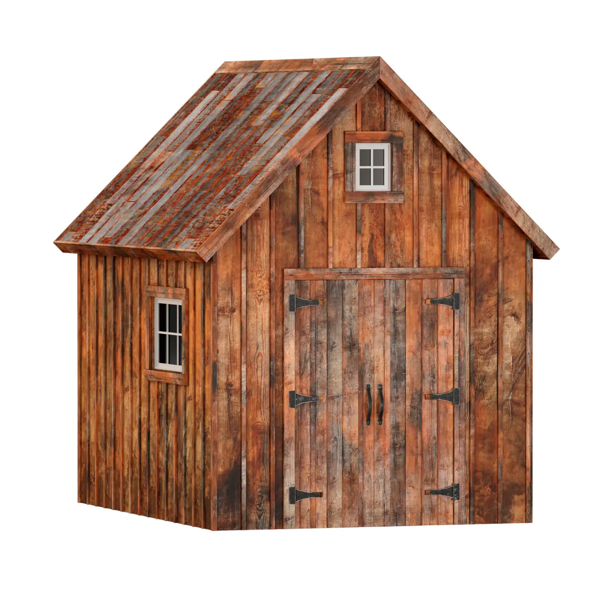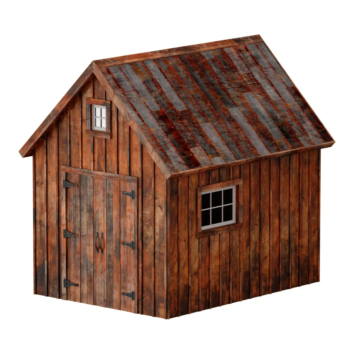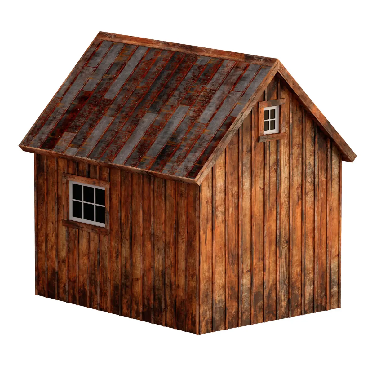 3d model of a forest wooden house with doors - gates, an attic and windows. It is made of boards, the roof is sheathed with sheet metal. The material is made with traces of wear, rust, antiquity, mold and the influence of weather conditions. It can be used as a forest, hunting, fishing house, as a barn, gatehouse, hut, farm building and so on.