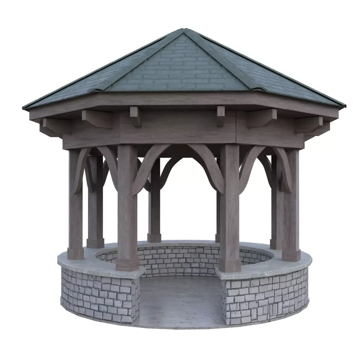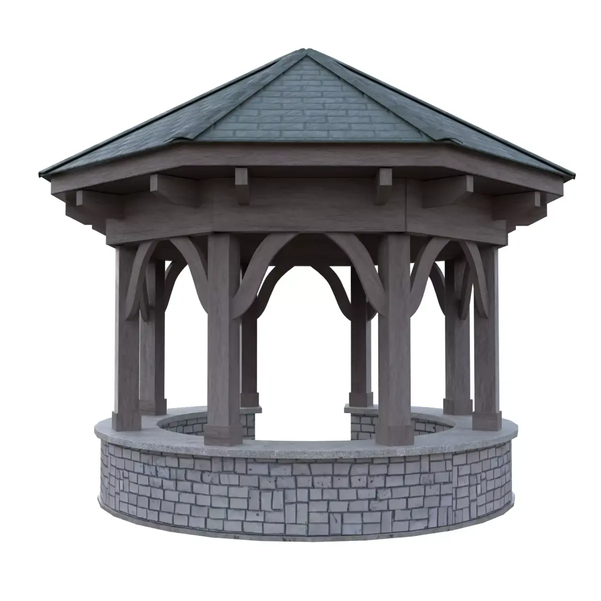 The model accurately represents atraditional octagonal gazebo with strong wooden beams, a shingled roof, and adetailed brick foundation — perfect for parks, gardens, courtyards, or fantasysettings.