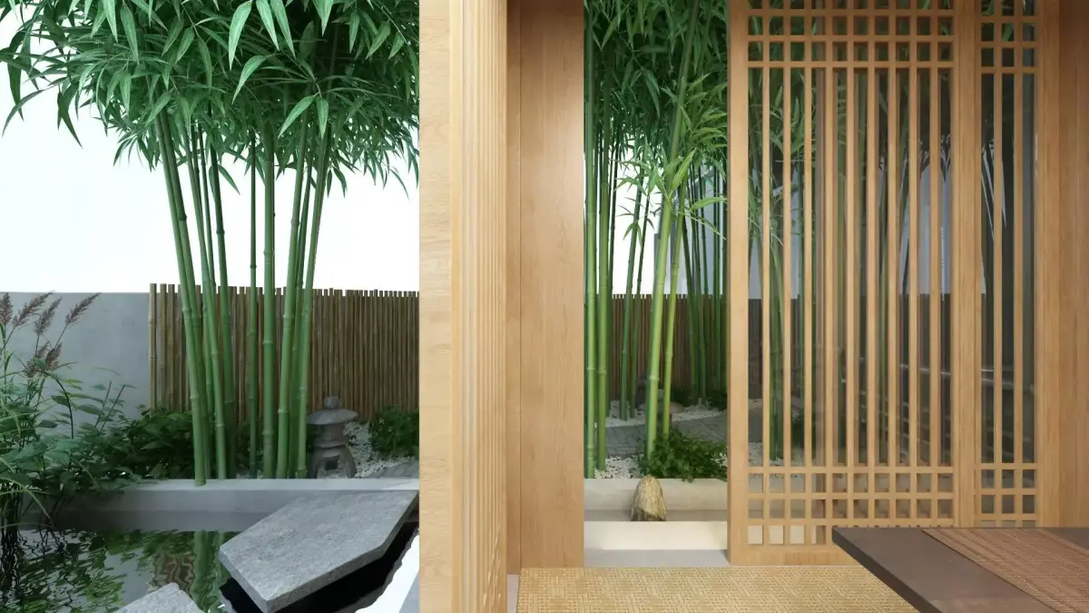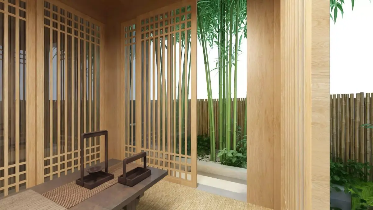 Wooden gazebo with a tea set surrounded with outdoor pond, greenery and bamboo fence.Gazebo size: 3500x3000 mm.