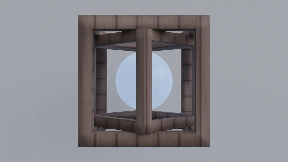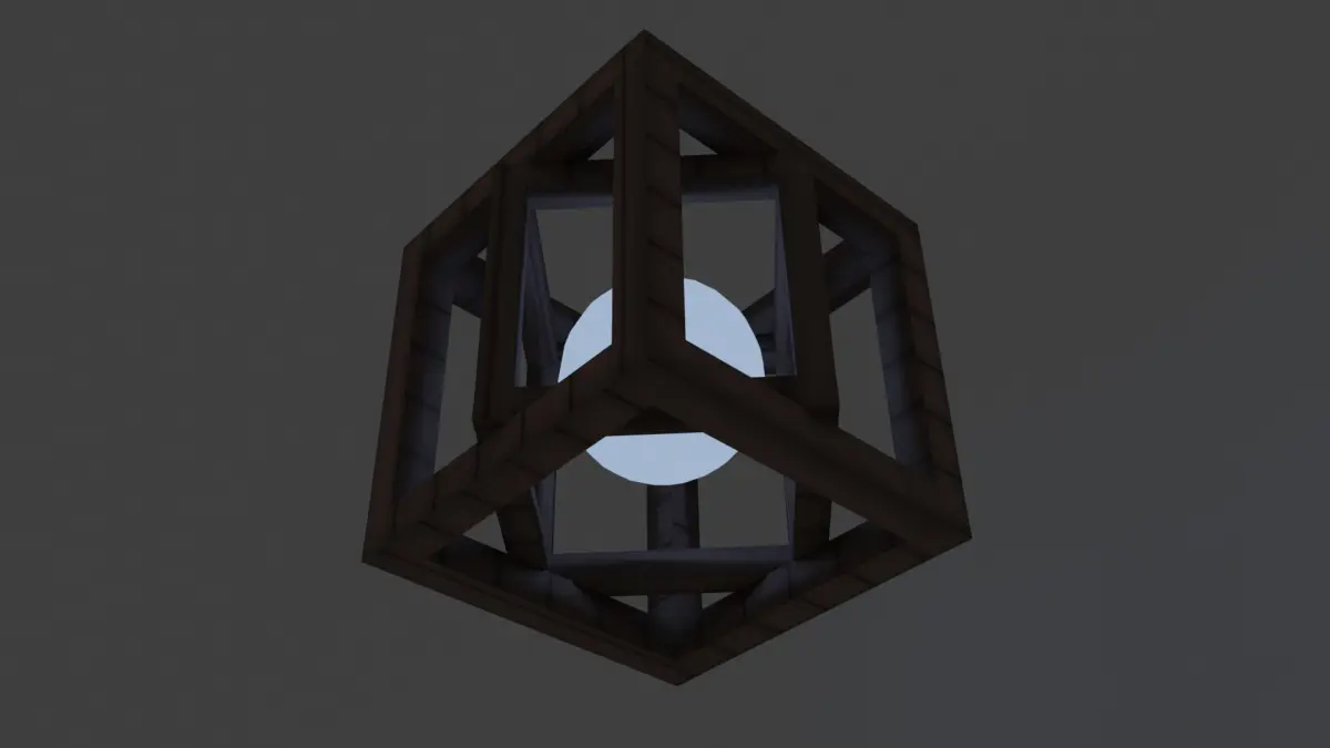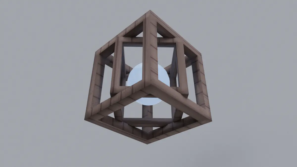 Uncover the secrets of the Ancient Luminous Core, a mystical geometric artifact crafted from aged wooden beams forming two interlocking cubes. Suspended at its heart, a softly glowing cyan sphere radiates an otherworldly energy, evoking a fusion of lost technology and arcane magic.