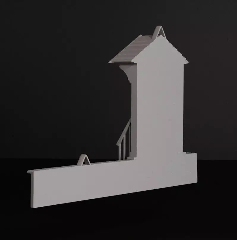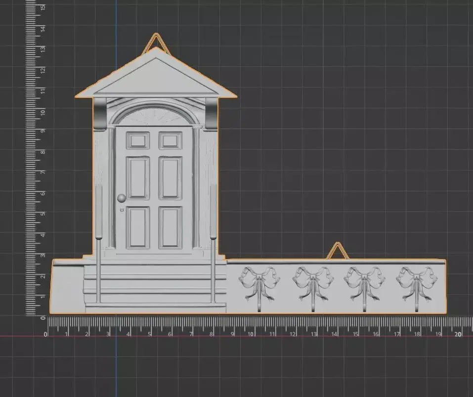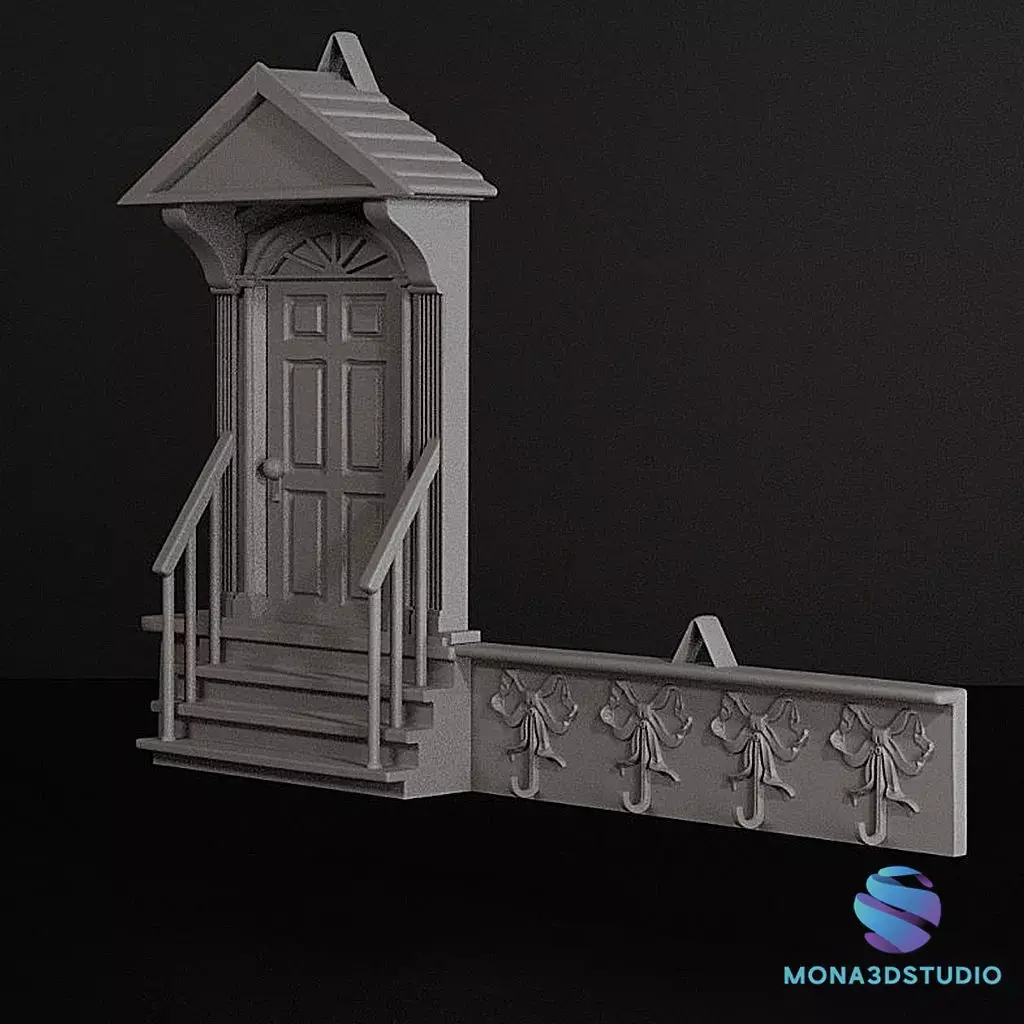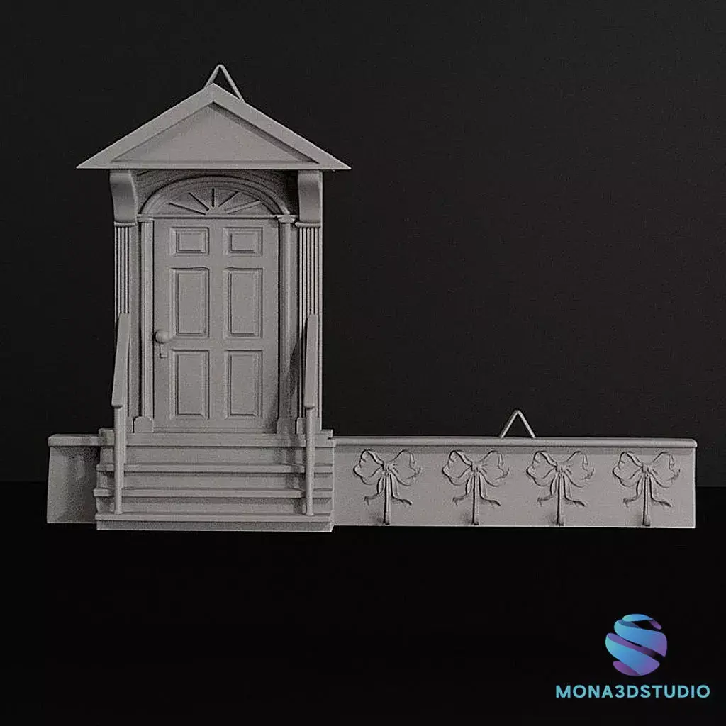 Elegant wall key holder featuring a classic house entryway design. It has a detailed door, a staircase, and a railing, with a lower section equipped with key hooks decorated with golden bows. Perfect for adding a touch of charm and organization to your home entrance. Ideal for 3D printing in materials like wood PLA or resin for a realistic look.
