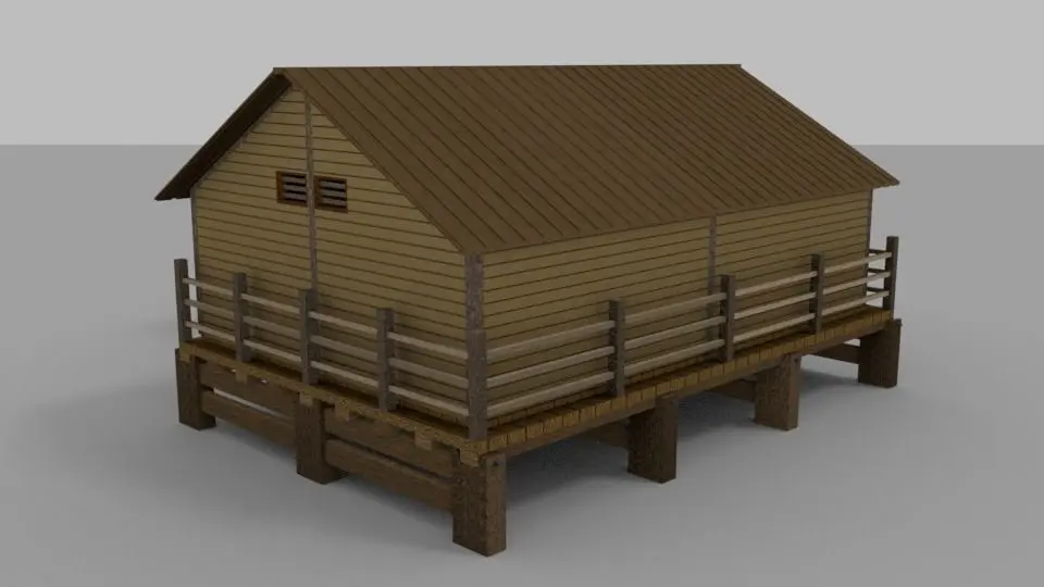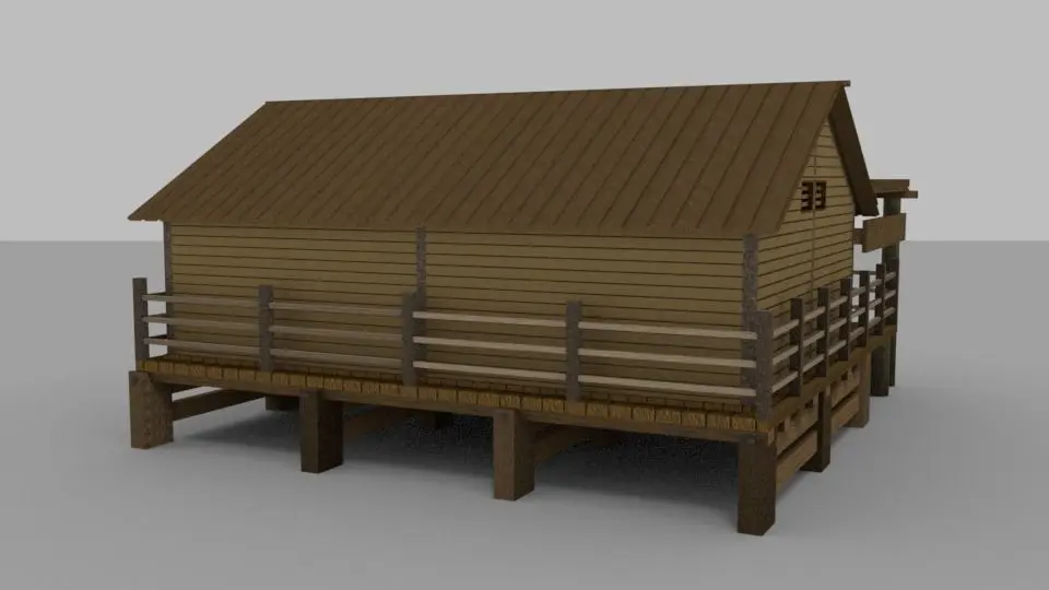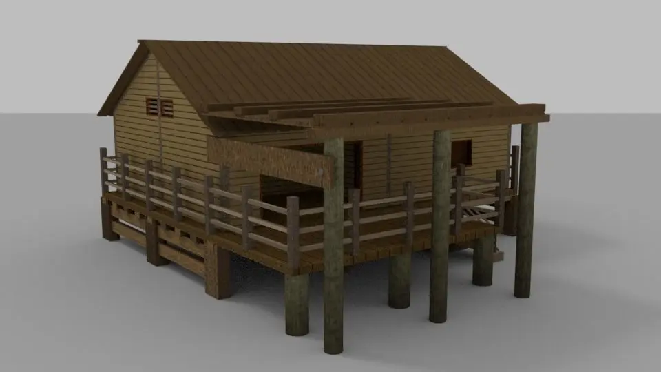 A wooden house with outside areas and with internal space. It is perfect for use in game designs because it has a satisfactory retopology.