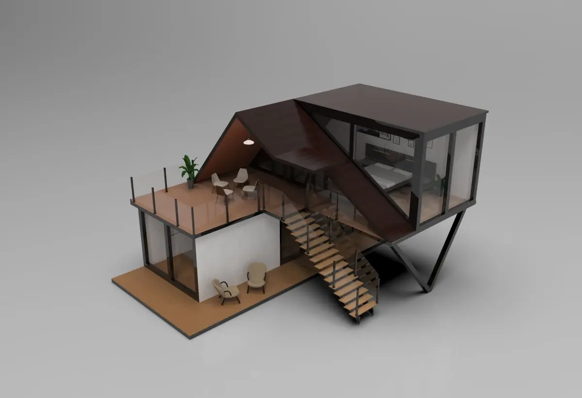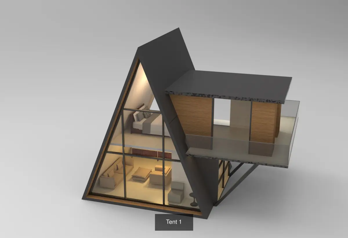 Tent house with 3d model and keyshot reandring with furniture layout. interior layout with lighting, shadow and contrast.