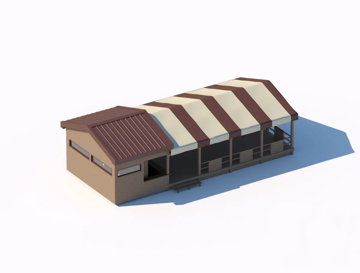 A stylish wooden pavilion featuring a striped canopy and side railings. Perfect for outdoor events, cafes, or relaxation areas.