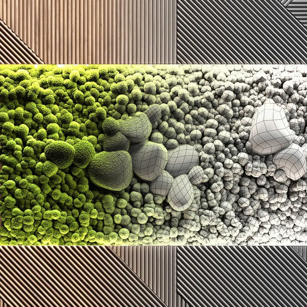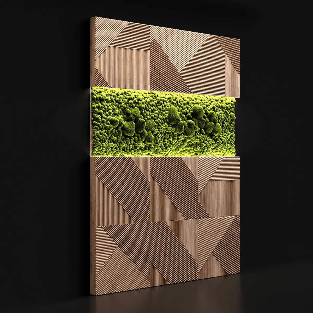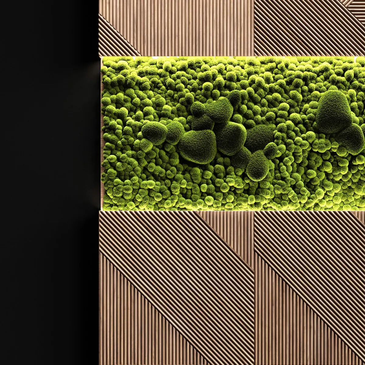 Composition of wood panel and stabilized moss with LED backlight. It can be used both in residential and in public premises, such as a restaurant, cafe or bar. Suitable for interiors in a modern style and for interiors in a loft style.