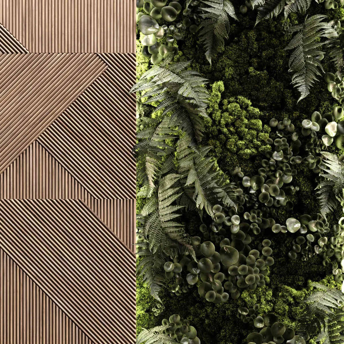 Wood panel and phytowall with LED backlight. The panel consists of slats dividing the surface into segments by their direction.