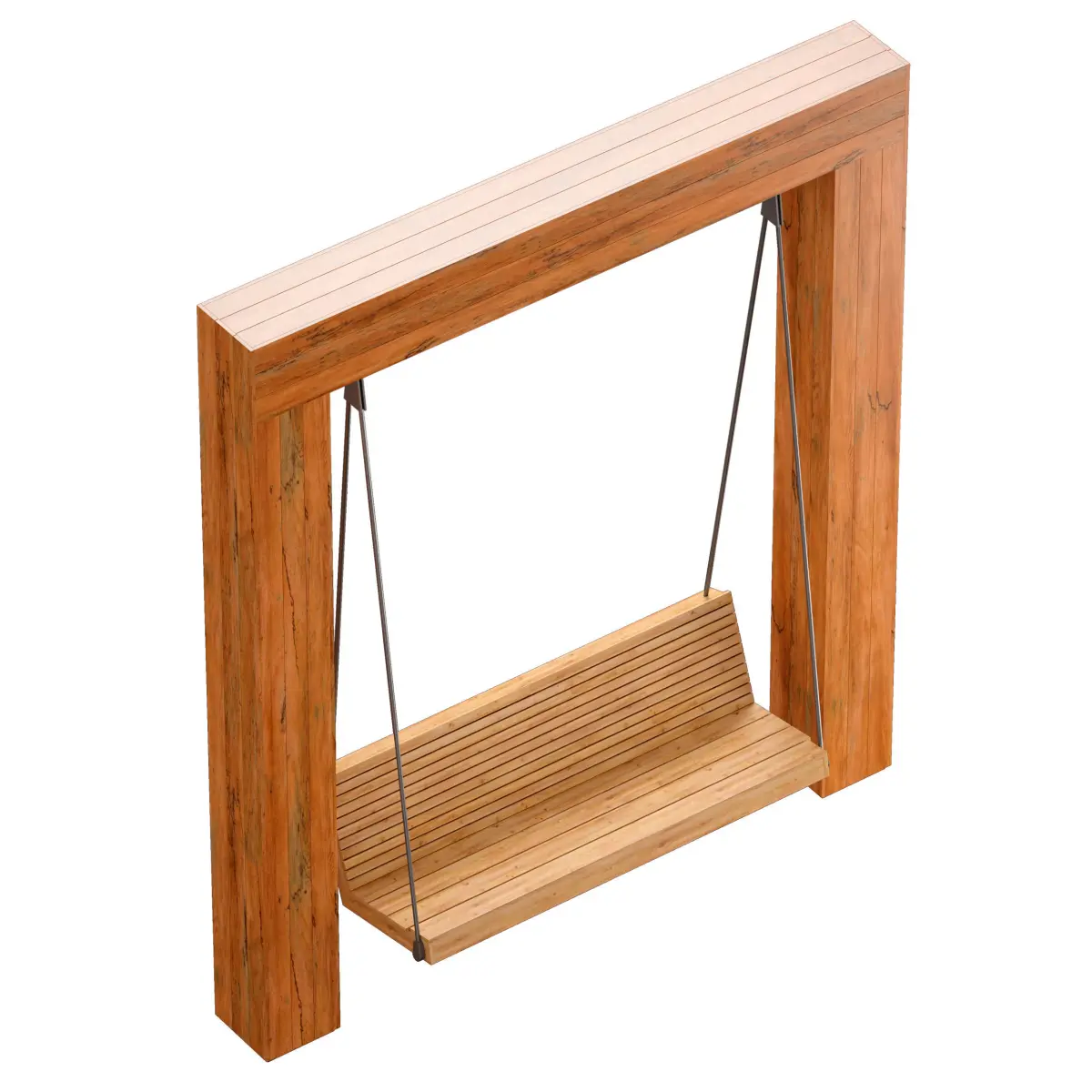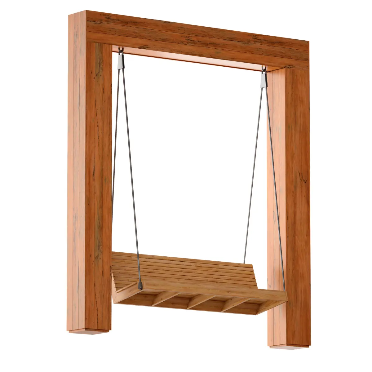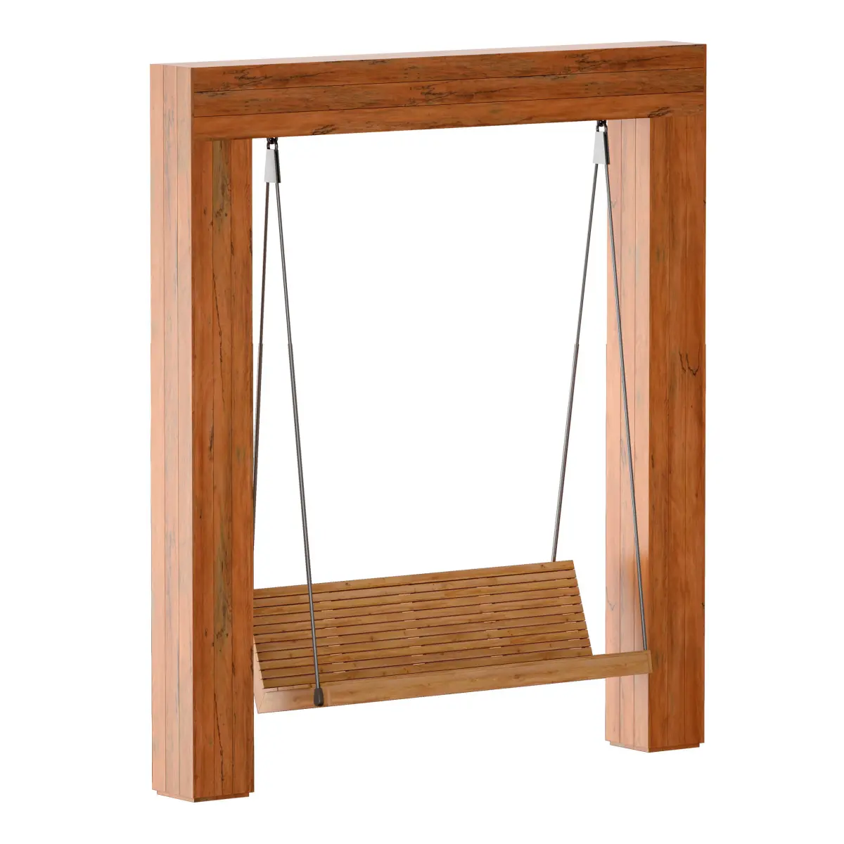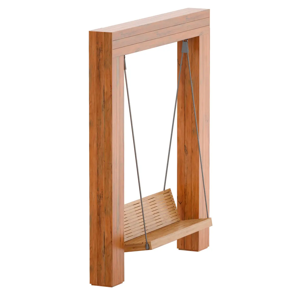 Park street swing made of light wood. A massive U-shaped arch, sheathed with boards, to which a rack bench with a backrest on metal suspensions is suspended. This swing will fit well into the exterior as a park architecture.