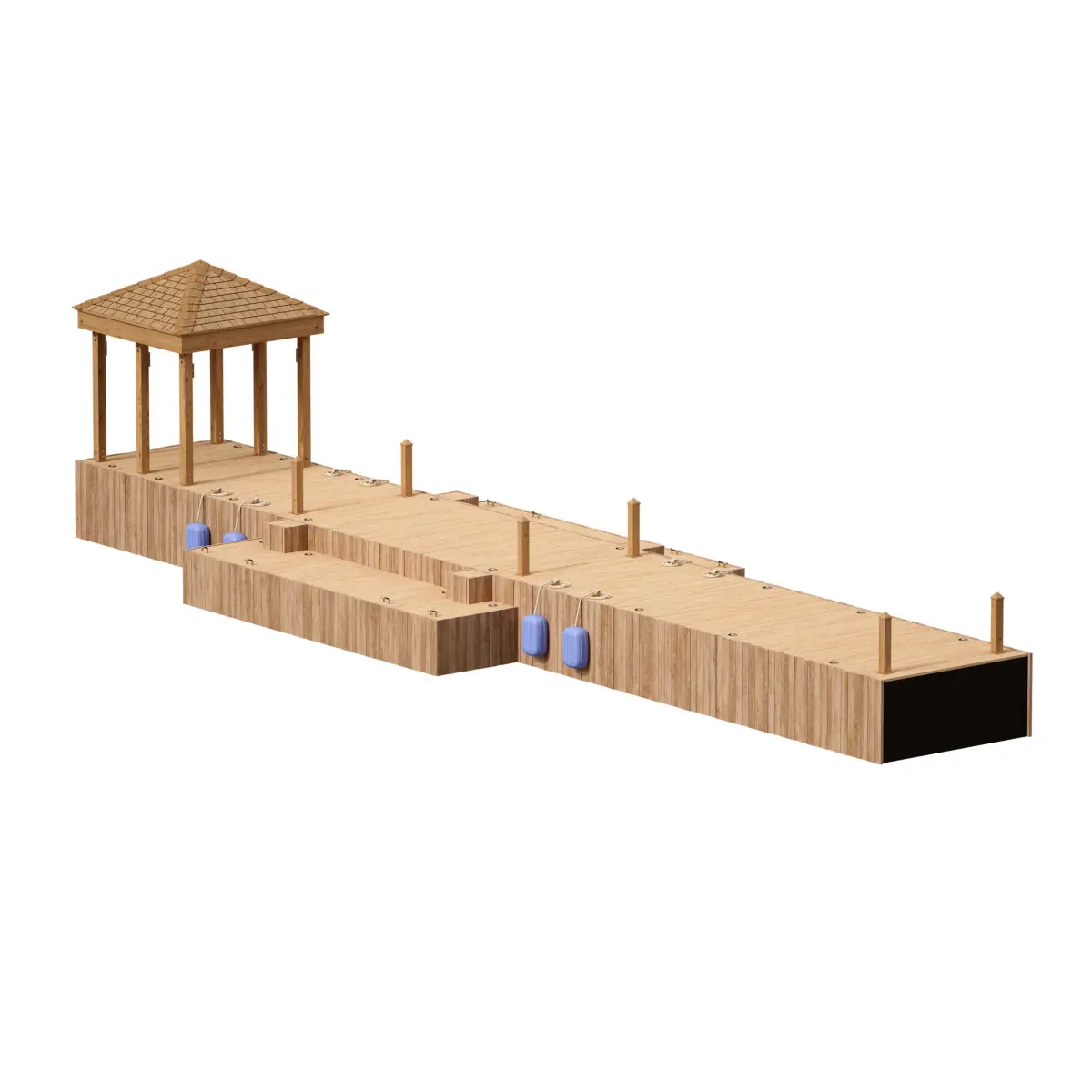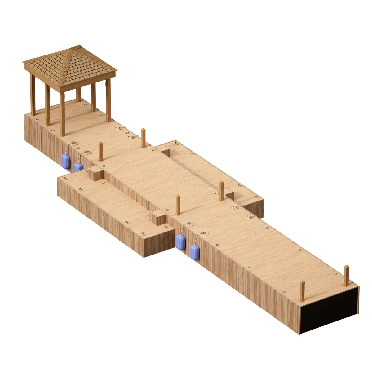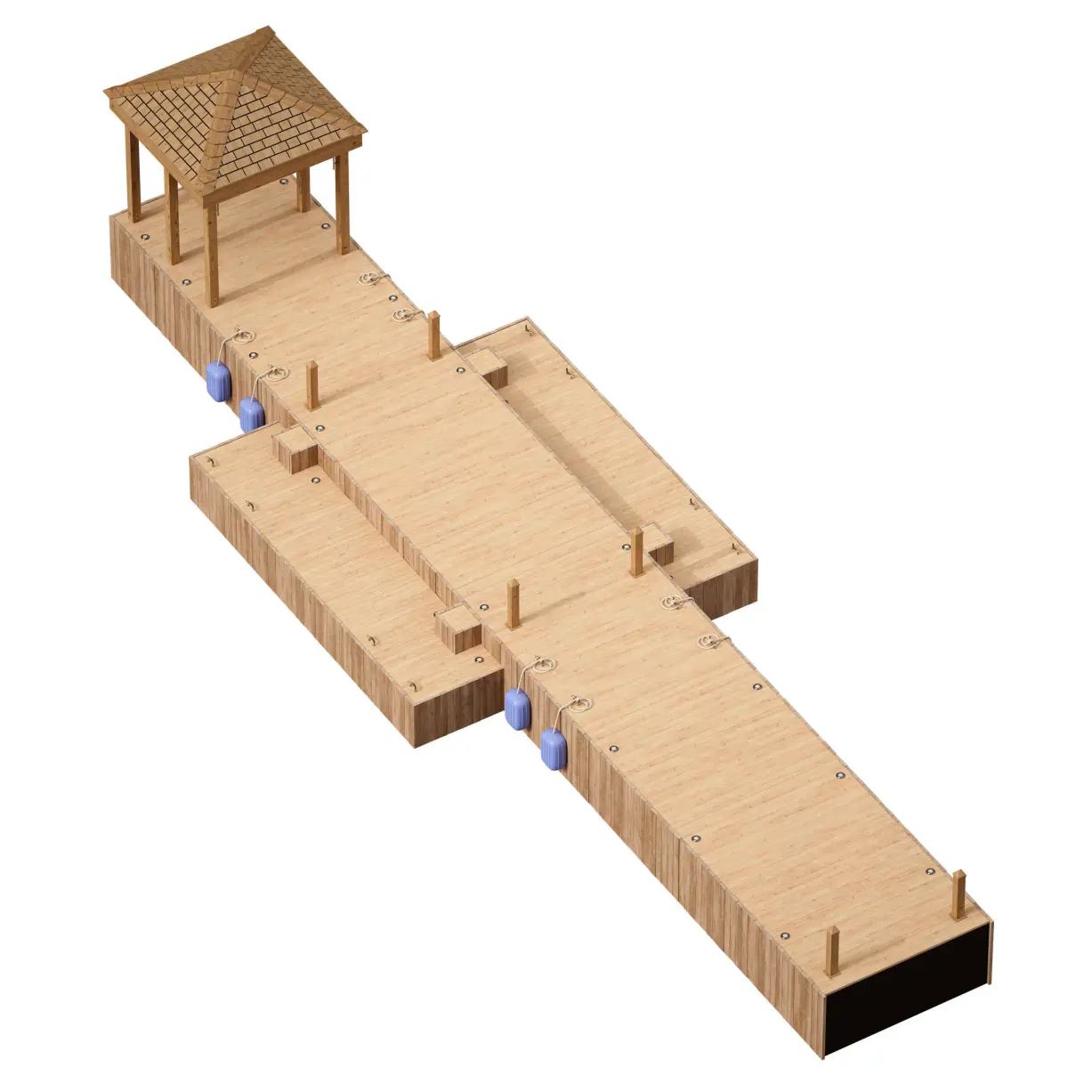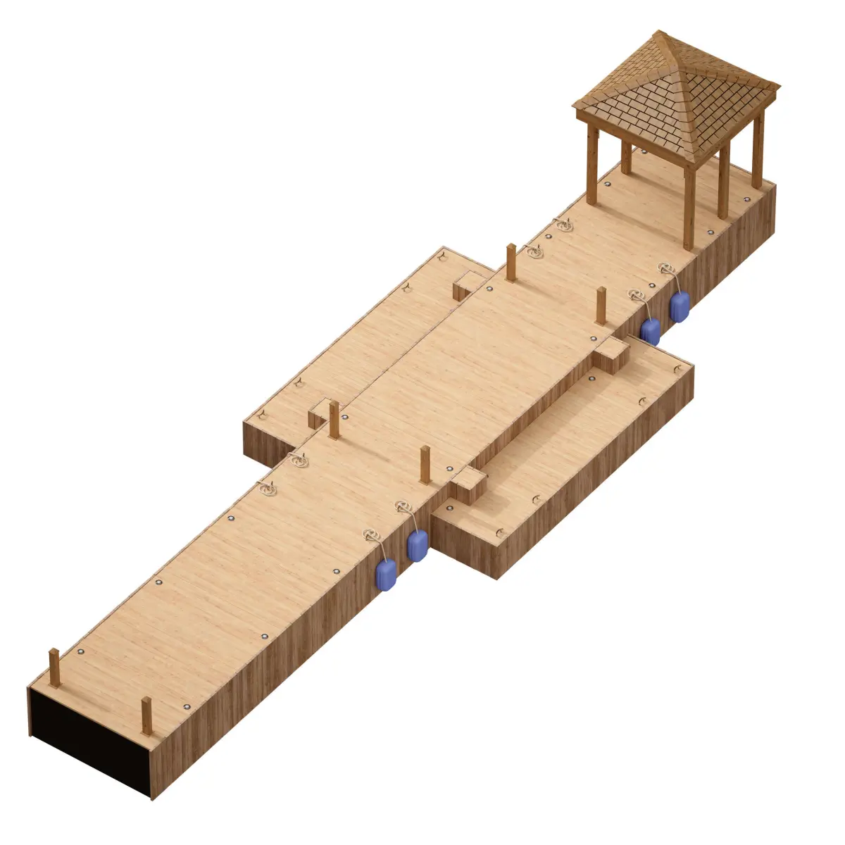 3D model of a coastal (river, sea) pier, pier, pier. Made of wood, knocked together from boards. The pier has a rectangular elongated shape. In the center there are platforms in the form of steps for descending to the water. At the edge of the pier there is a building in the form of a gazebo with a roof placed on wooden posts and columns. Among the details, the model contains fastenings for tying boats, floating buoys (floats) suspended on rope ropes, lamps, and decorative posts.