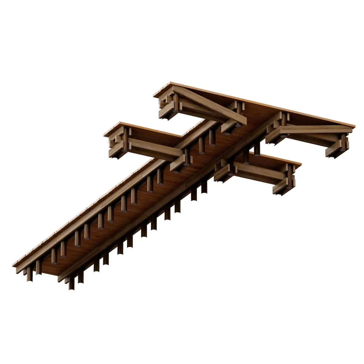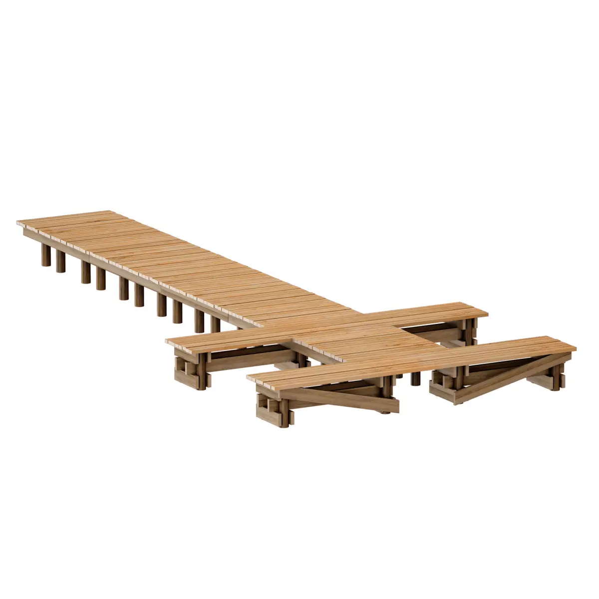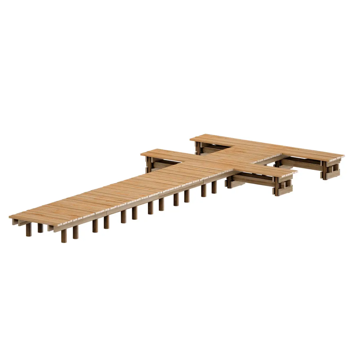 3d model of a small river pier, pier, pontoon made of wood. The frame is installed on wooden posts, a boardwalk is laid on top.Dimensions: 450cm x 1050cm x 58cm