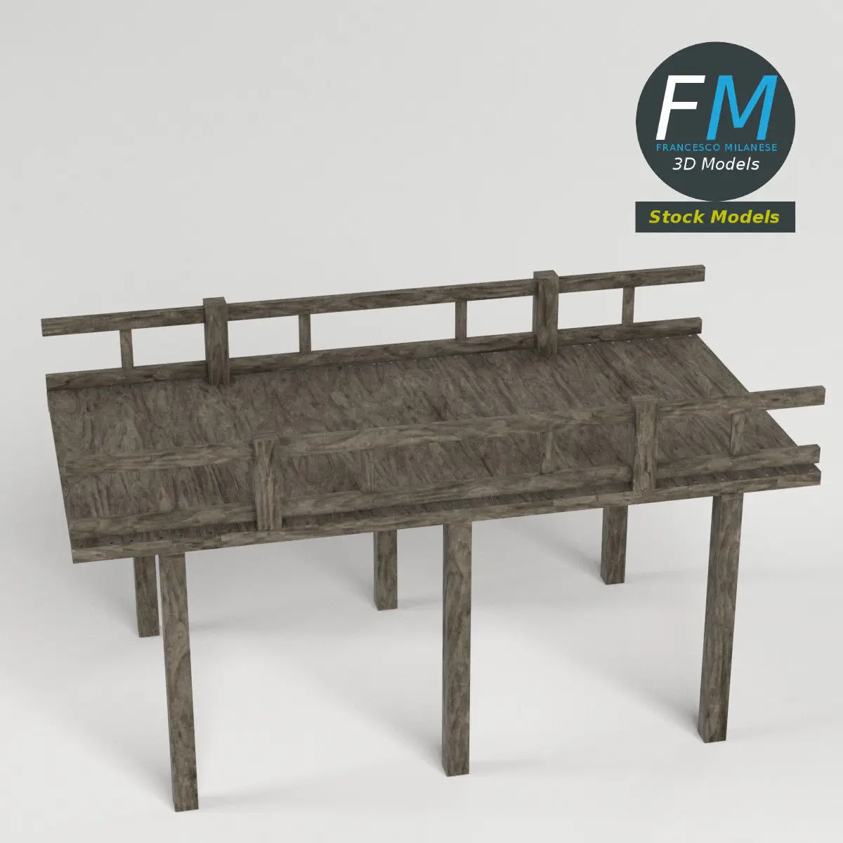 Wooden pier module with railing 3D Model. Single object, to be used as is (you can create a long catwalk by using an array or vector modifier). Production-ready 3D Model, with PBR materials, textures, non overlapping UV Layout map provided in the package.