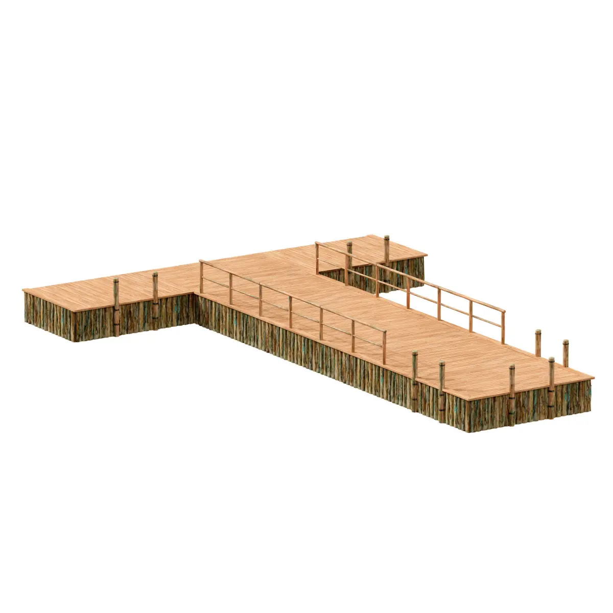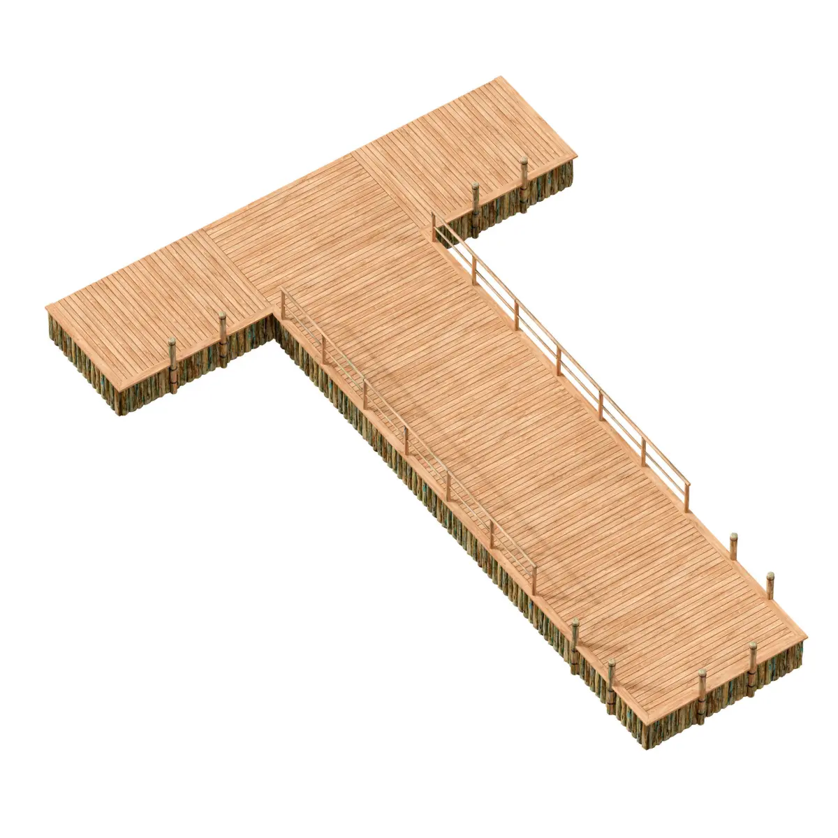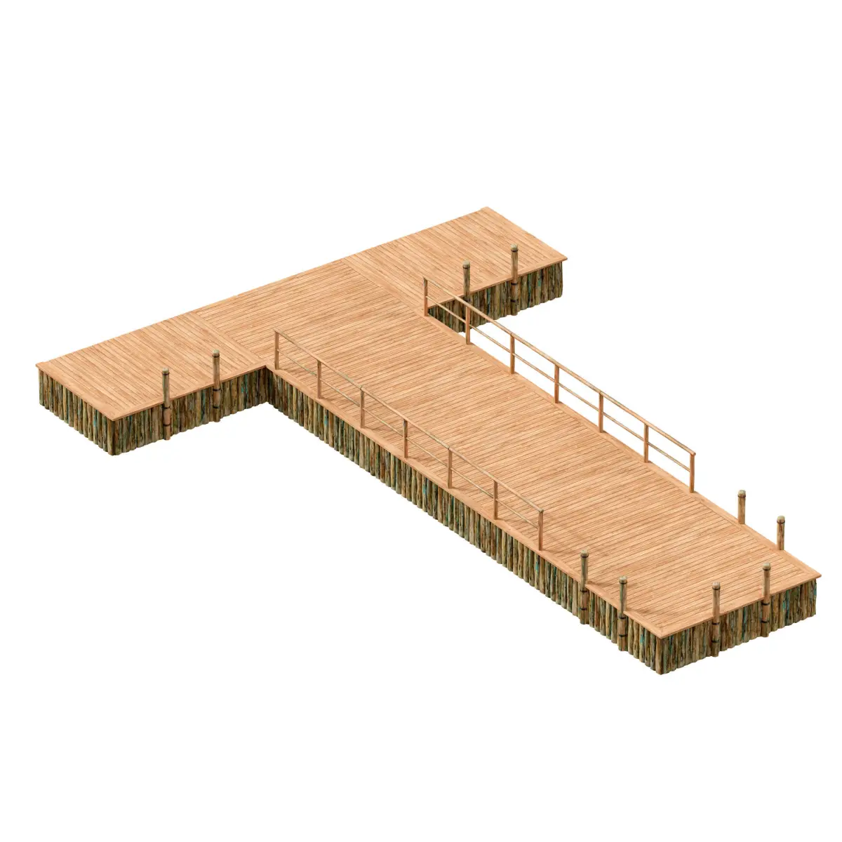 3d model of a wooden river pier, berth. Boardwalk made of light wood, wooden railings, poles for tethering boats with metal rings. Along the perimeter, the pier is supported by logs. The texture of the logs is aged, simulates the effects of time and water. If desired, the design and dimensions of the berth can be easily changed by copying or removing model elements.