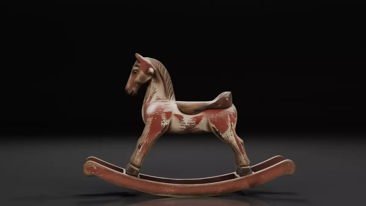 A highly detailed, realistic 3D model of a vintage wooden rocking horse. This asset features carefully crafted worn and weathered textures, showcasing chipped red paint, exposed wood grain, and a generally aged appearance that gives it authentic character.