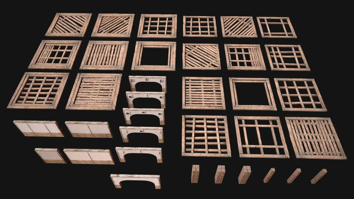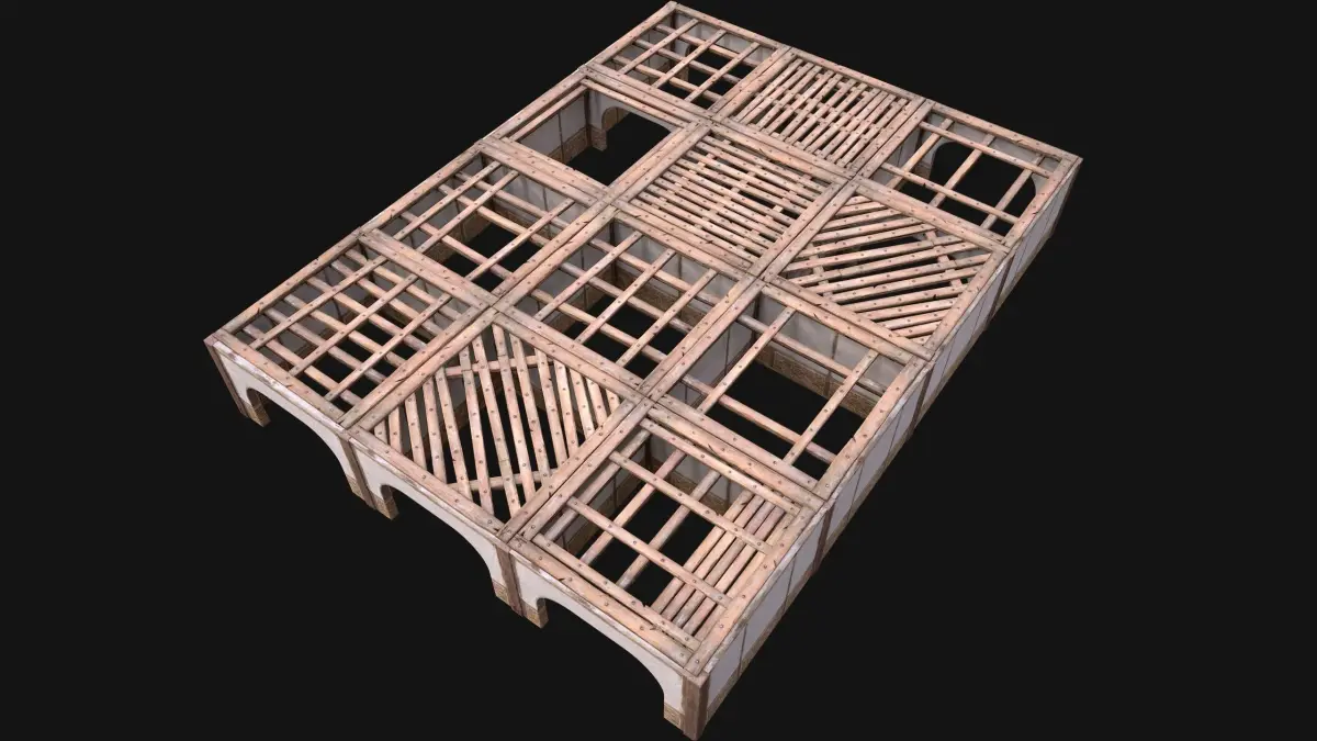 Game ready models Wooden Roof Medieval Pack .The models contains lods, detailed information on the images.Stylized and detailed Wooden Roof Medieval Pack textured, sculpted and rendered with Physical based rendering (PBR) - Shown images have been rendered in Marmoset Toolbag .The set contains 20 models of wooden roofs, 4 models of roofs, 6 models of wooden columns, 6 models of walls with an arch.