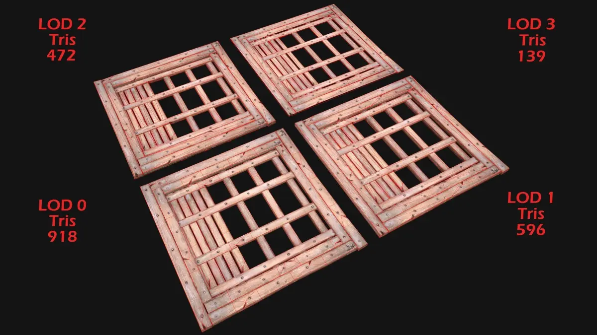 - Tris: 918(LOD0),596(LOD1),472(LOD2),139(LOD3).