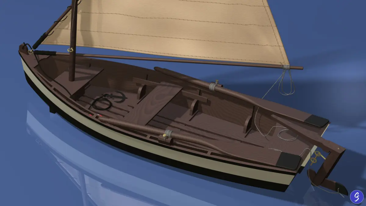 Highly-detailed wooden sailboat scale model, ready for use in CGI applications. Modeled in Carrara Studio and provided in multiple file formats (OBJ, FBX, 3DS, CAR, and STL). Details include rudder, oars, anchor, life ring, rigging lines, hardware, and more. Mast, boom, spar, sail, rudder, oars, anchor, life ring, and rigging lines are modeled as separate objects that can be repositioned or animated as desired. All model textures are included. Water and sky textures used in rendered scenes are also included.