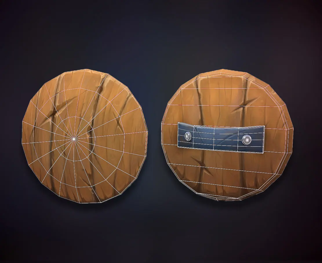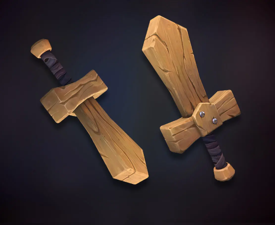 Low-poly hand-painted models of a wooden fantasy shield and sword.