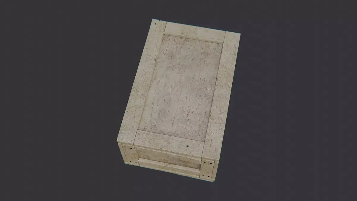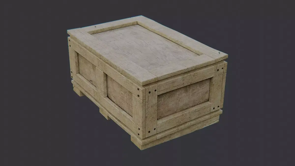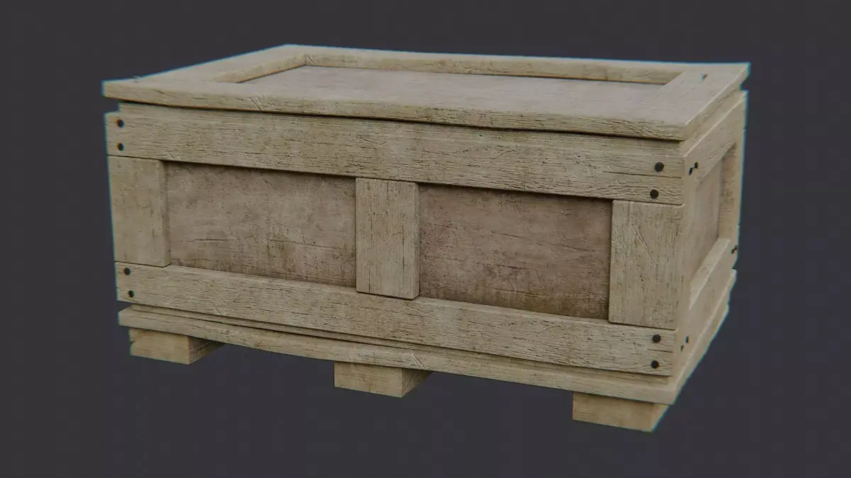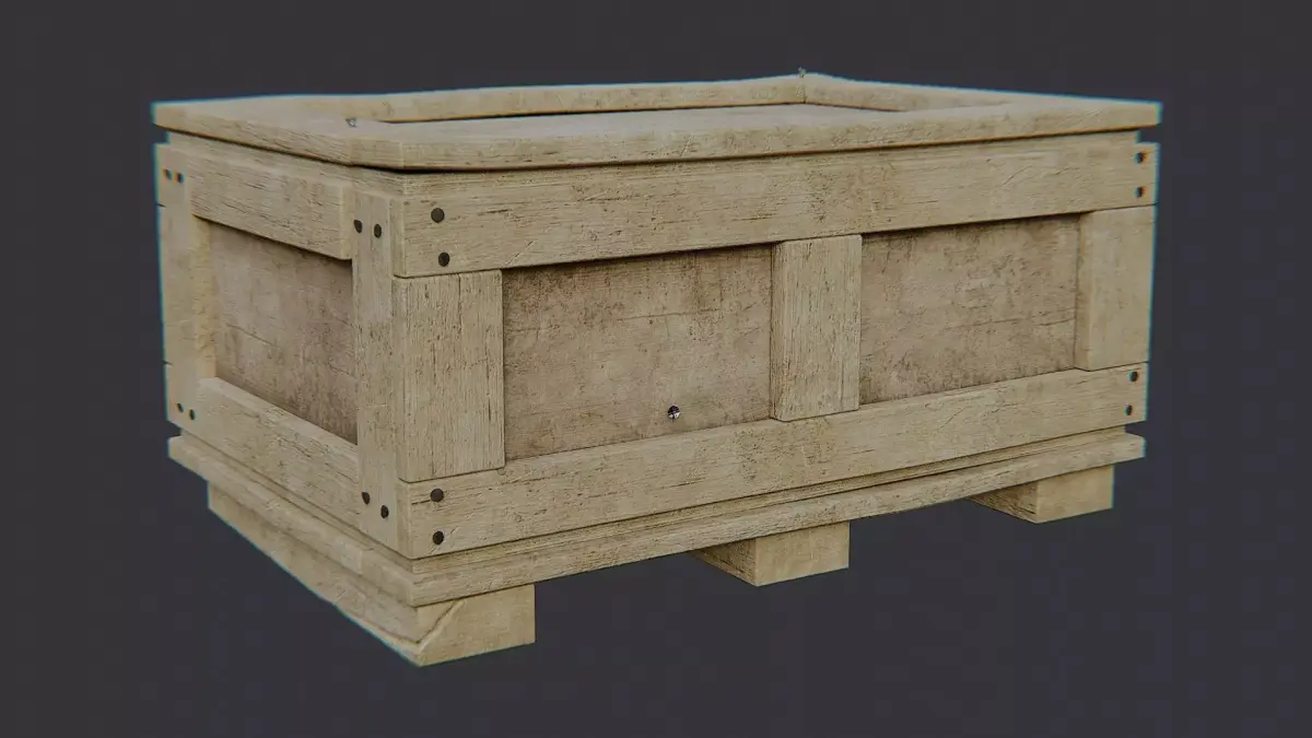 Sturdy wooden shipping crate with reinforced corners and planked sides. Built to convey storage and transport scenes in architectural, product, and asset renders. Textured wood material with realistic grain and subtle wear for believable presentation. Suitable for warehouses, crates, pallets, and display setups.
