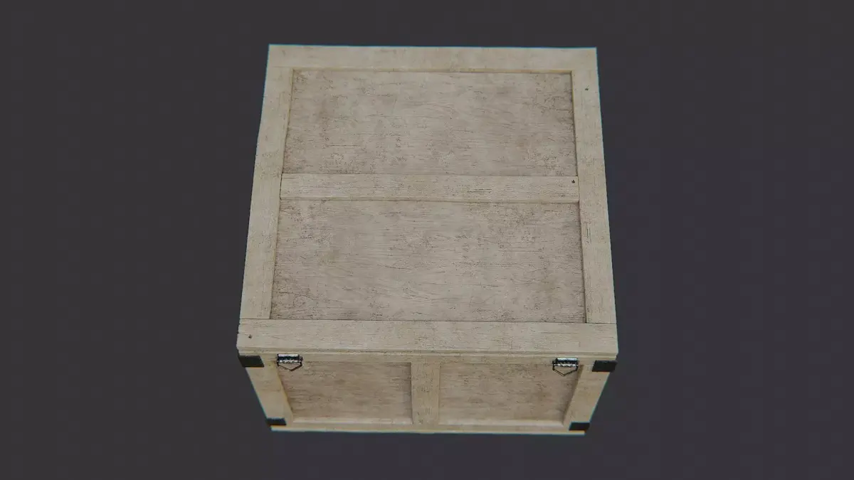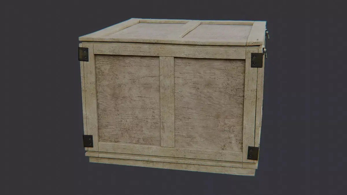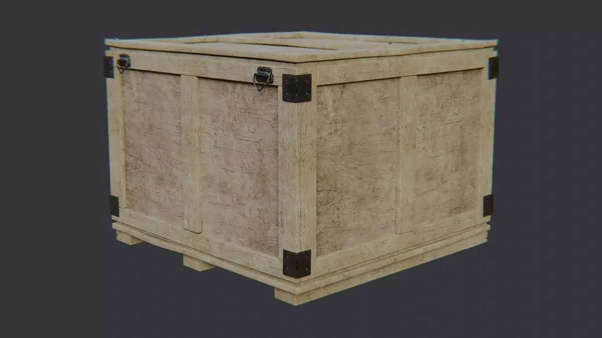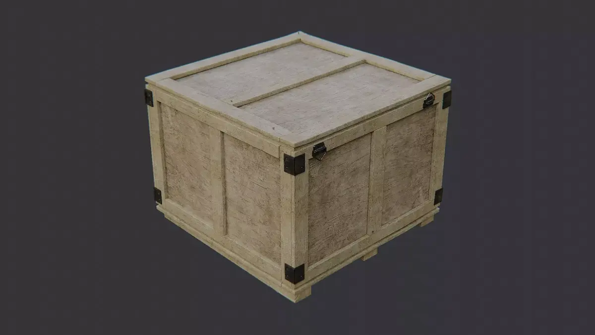 Solid wooden shipping crate with metal corner reinforcements, designed for realistic product renders and industrial scenes. The texture highlights natural wood grain and beveled panels for authentic wear. UV mapped for seamless integration in standard pipelines, suitable for archive storage visuals, warehouse interiors, or packaging demonstrations.