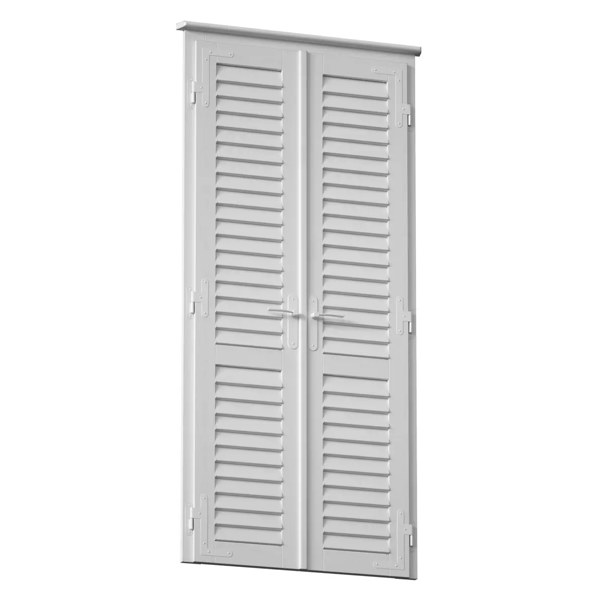3D model of wooden shutters blinds for doors and windows. Made of wood, painted white. There are handles and awnings. The model includes a door and a window in a closed state, as well as an example in an open state. If desired, you can open the shutters, as well as turn the elements of the blinds to open them to the desired angle.