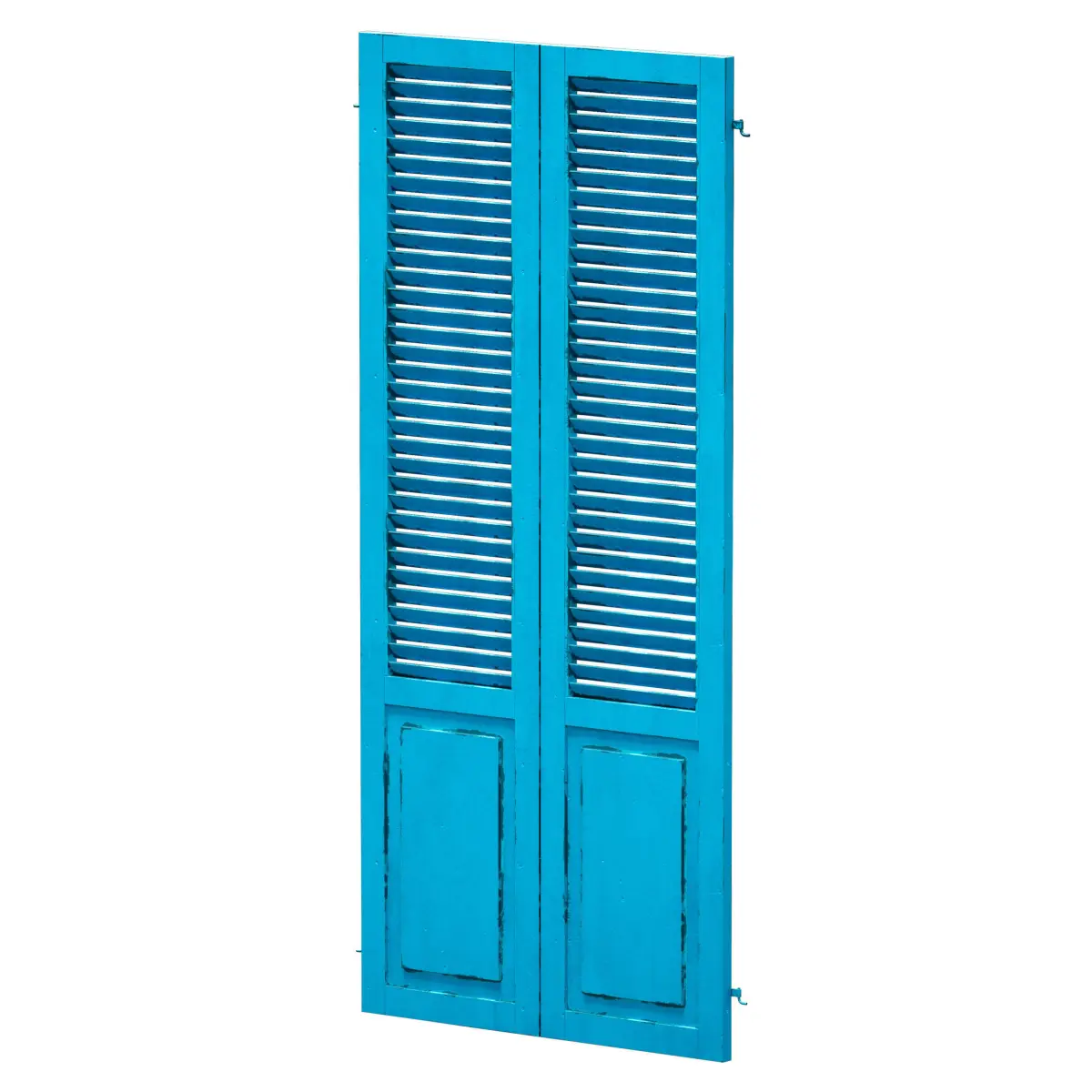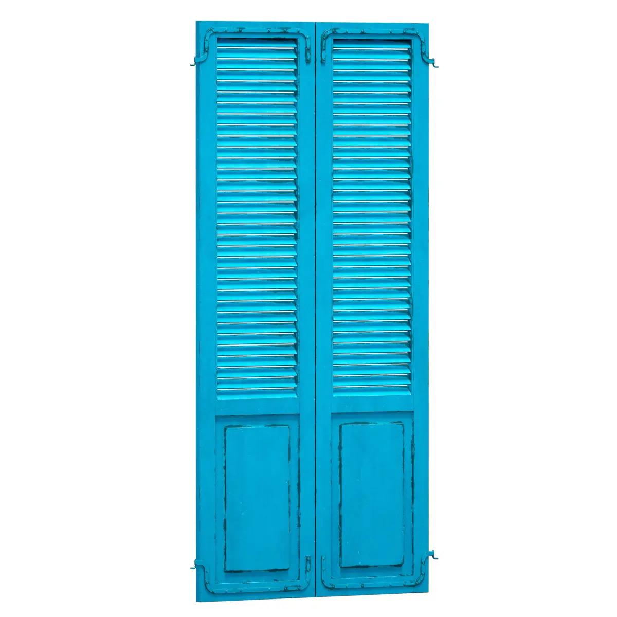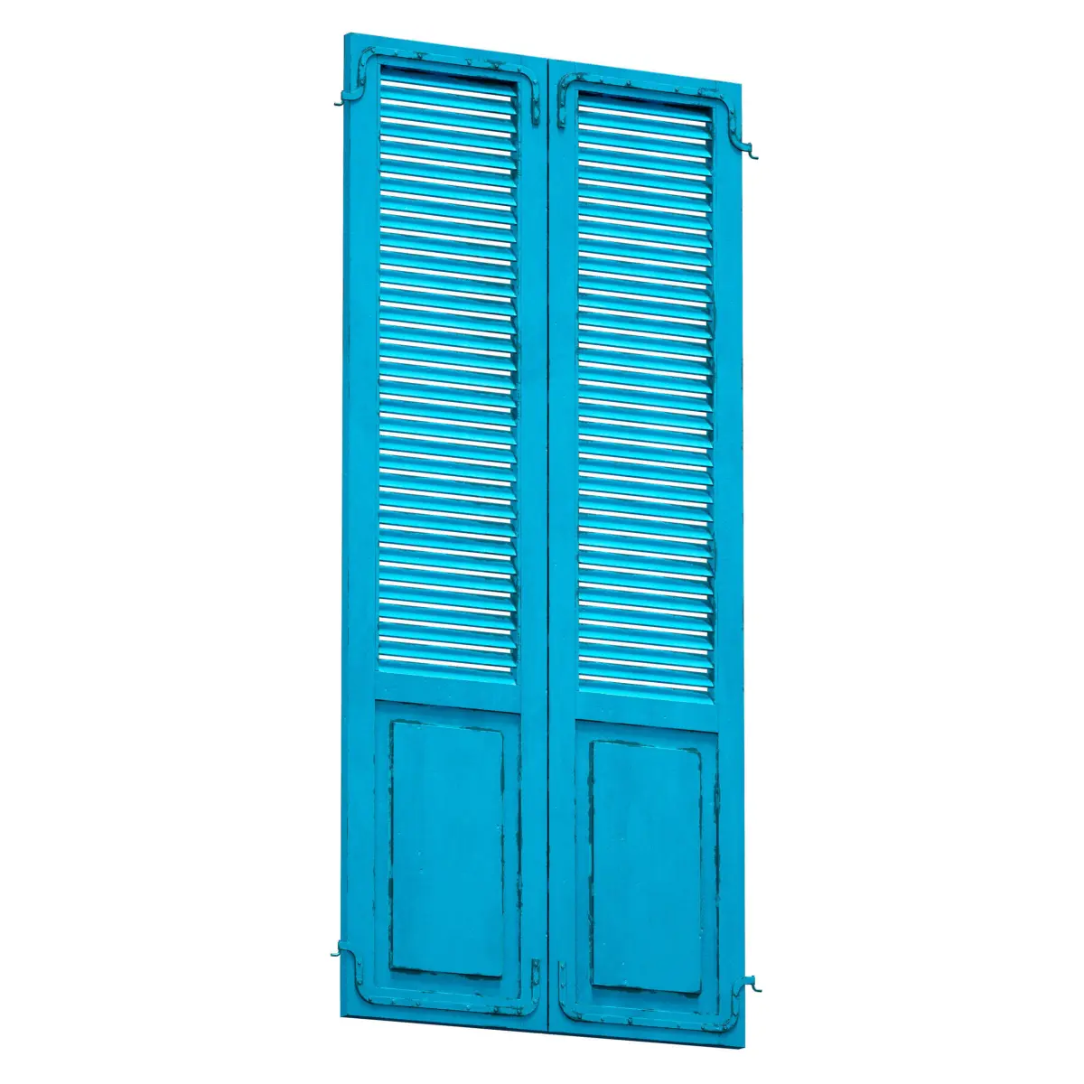 Wooden shutters, louvered doors, painted blue, with wear elements, on characteristic metal canopies. The model can be used as a facade element or decor element.