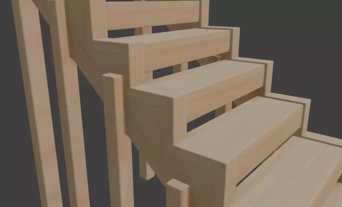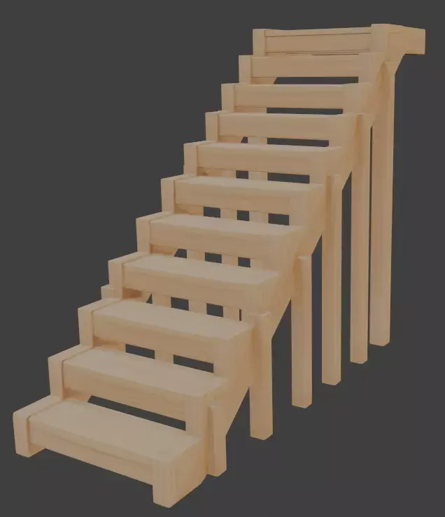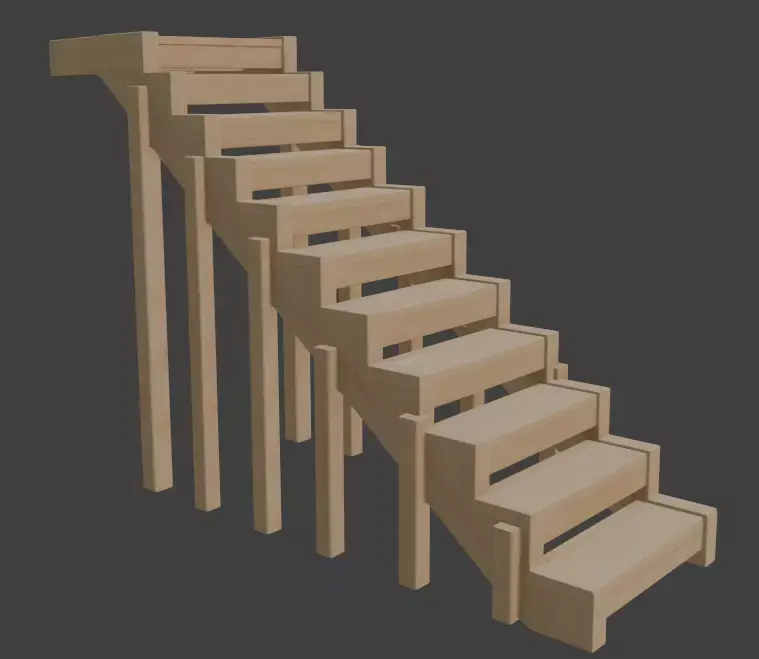 A clean and contemporary 3D model of an open-riser floating wooden staircase with thick treads and simple vertical supports. Ideal for modern interior visualizations, loft apartments, minimalist architecture renders, real-time applications, and stylish home design projects.