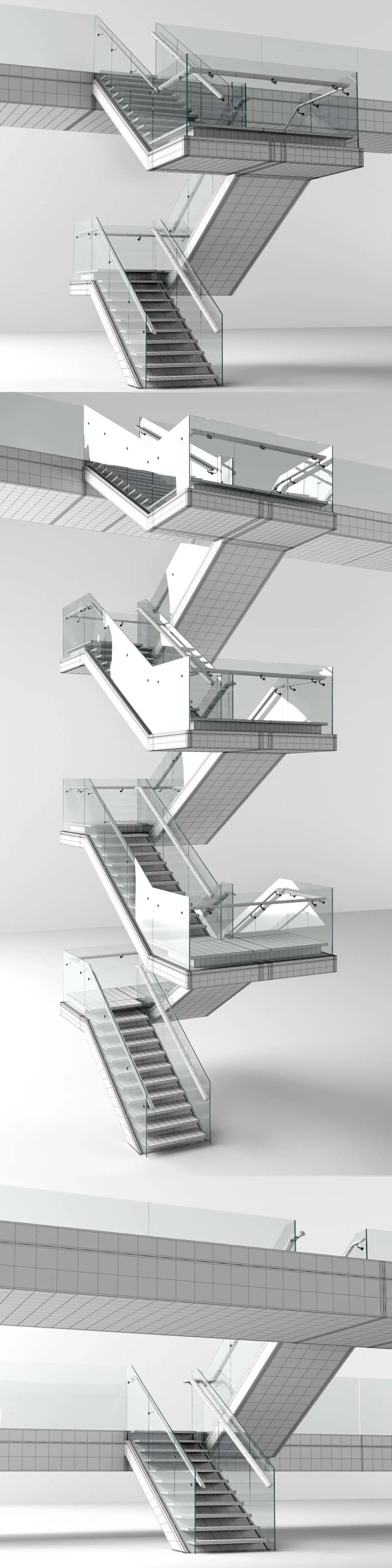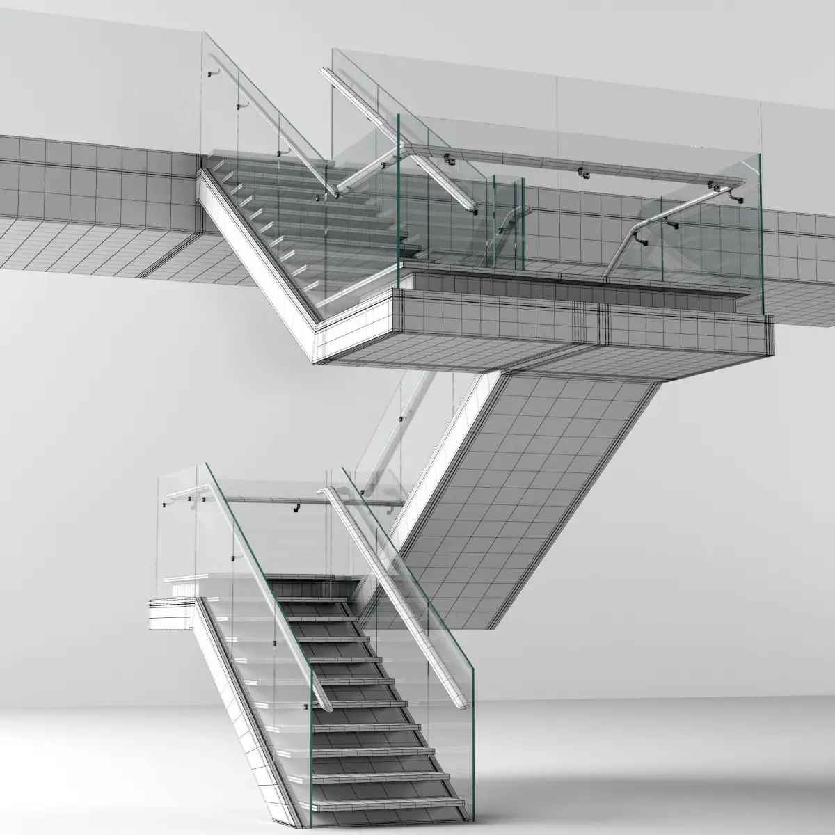 In the complete set of 4 configurations of stairs with a wooden frame and a glass fence. And the designer for making multi-storey configurations.