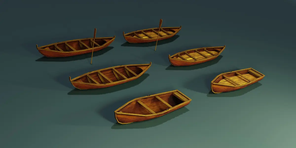 This package has 6 wooden boats and 2 wooden ore with 2k and 4k textures. They have the same textures and uv map. There is no overlapping in uv-maps.