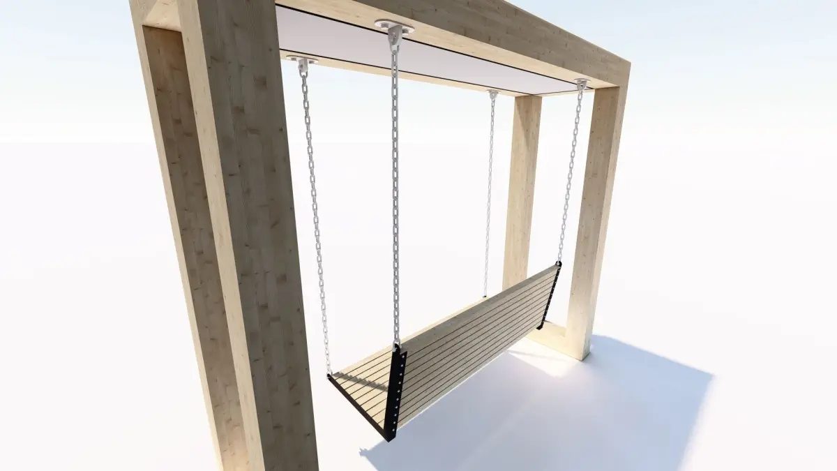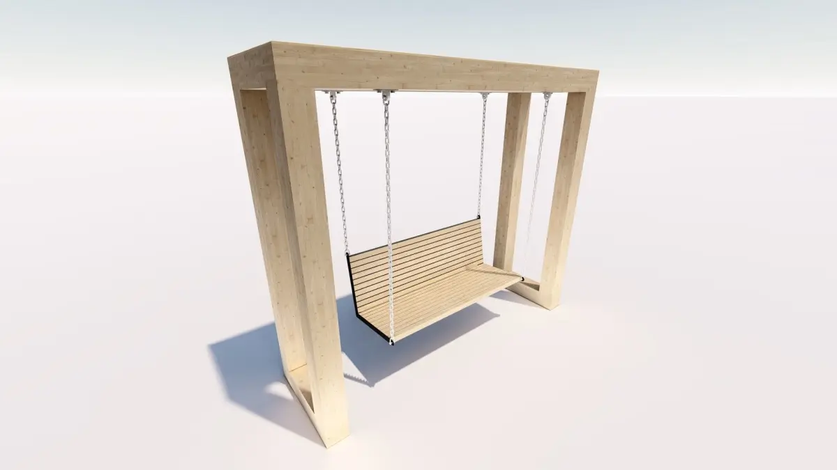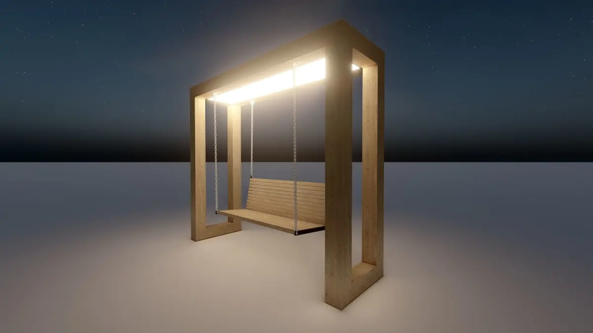 A wooden swing made of glued laminated timber with illumination is ideal for modern parks, squares and private areas. Height 2160mm, length 2500mm, width 750mm. Rendered on Lumion 10
