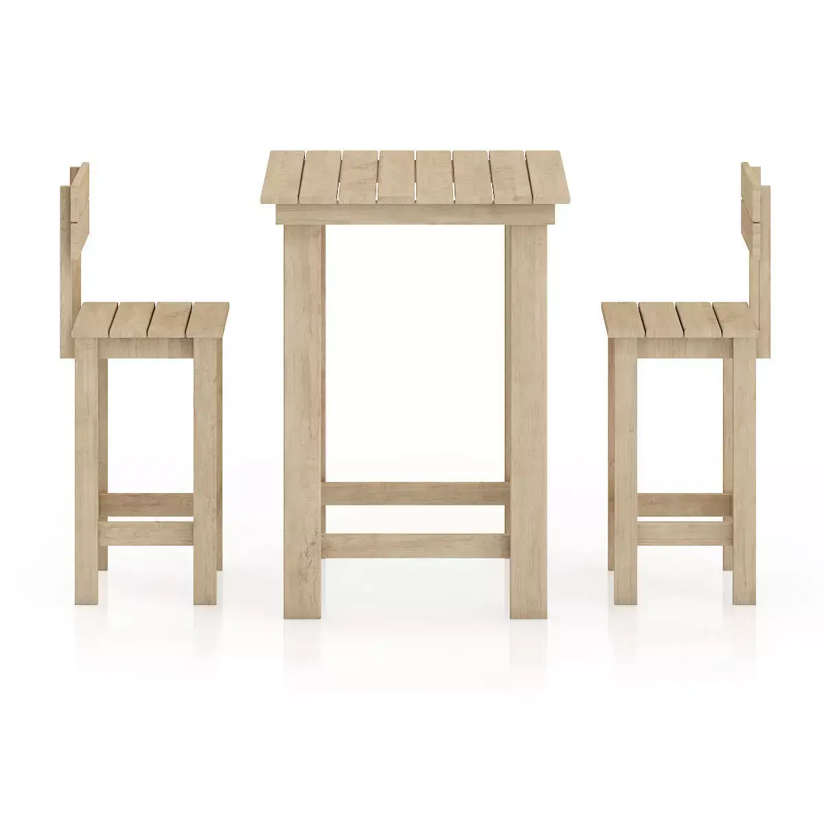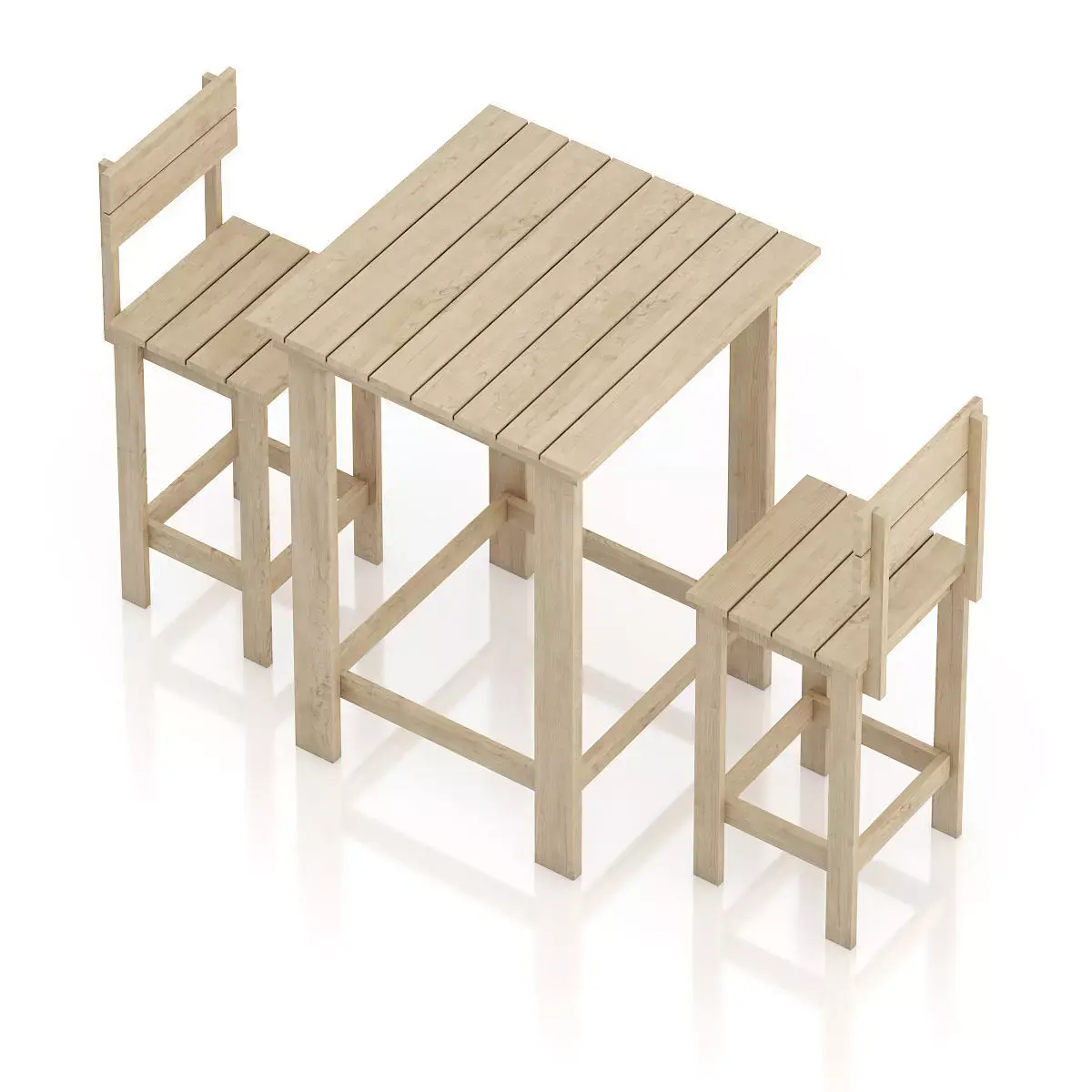 3D model of tall wooden table with two chairs made of lightwood. Compatible with 3ds max 2010 or higher and many others.