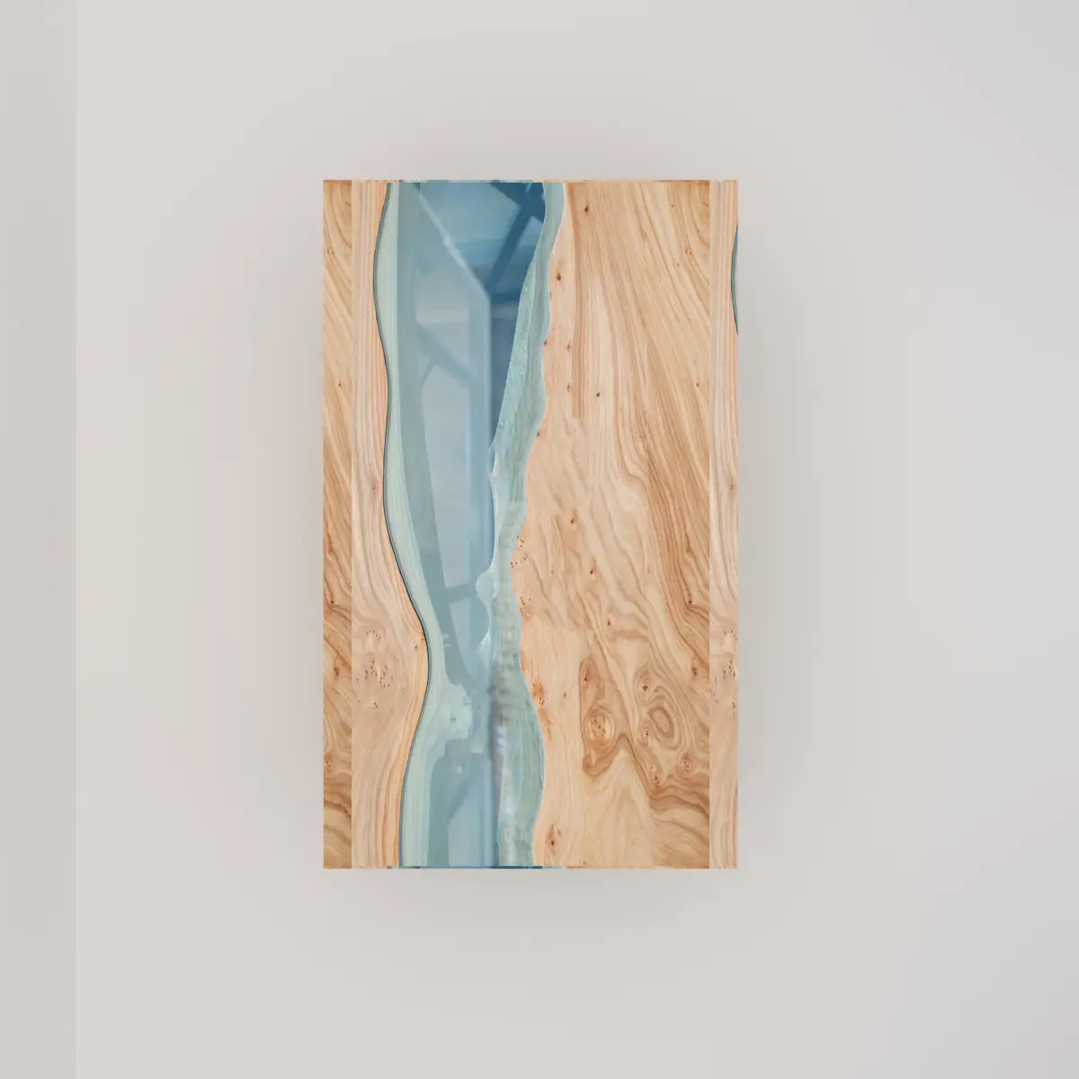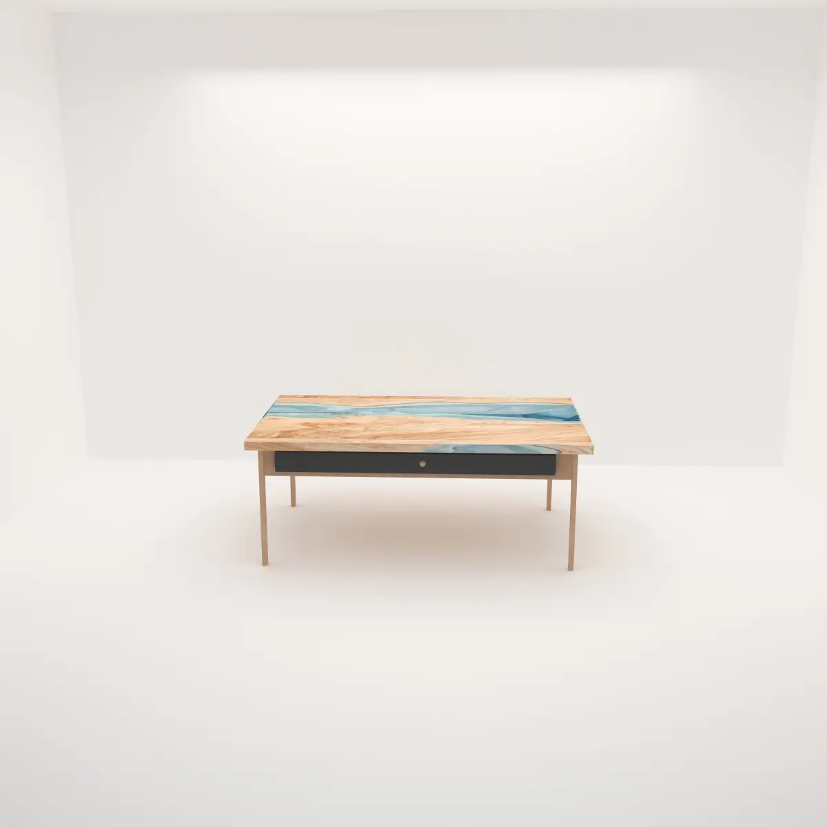 wooden table with resinlight wood shade with light blue resin and small drawer underneath the top of the table