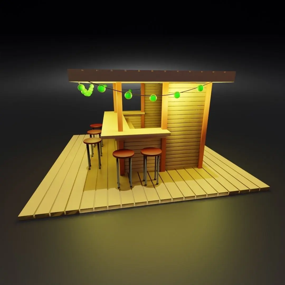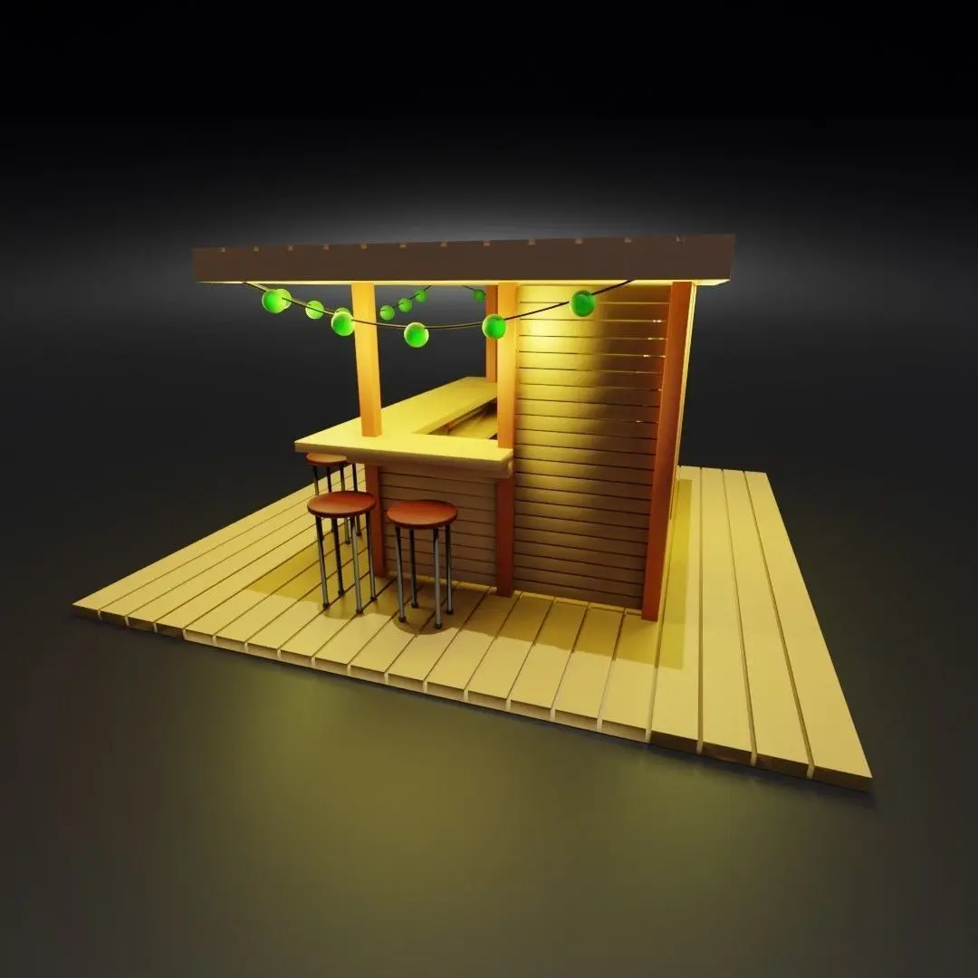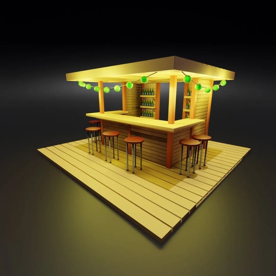 A model of a wooden tiki bar, with shelves, bottles of alcohol, a wide counter and a shelf on the inside, several high chairs, and three garlands of spherical bulbs. The model is available in several formats.