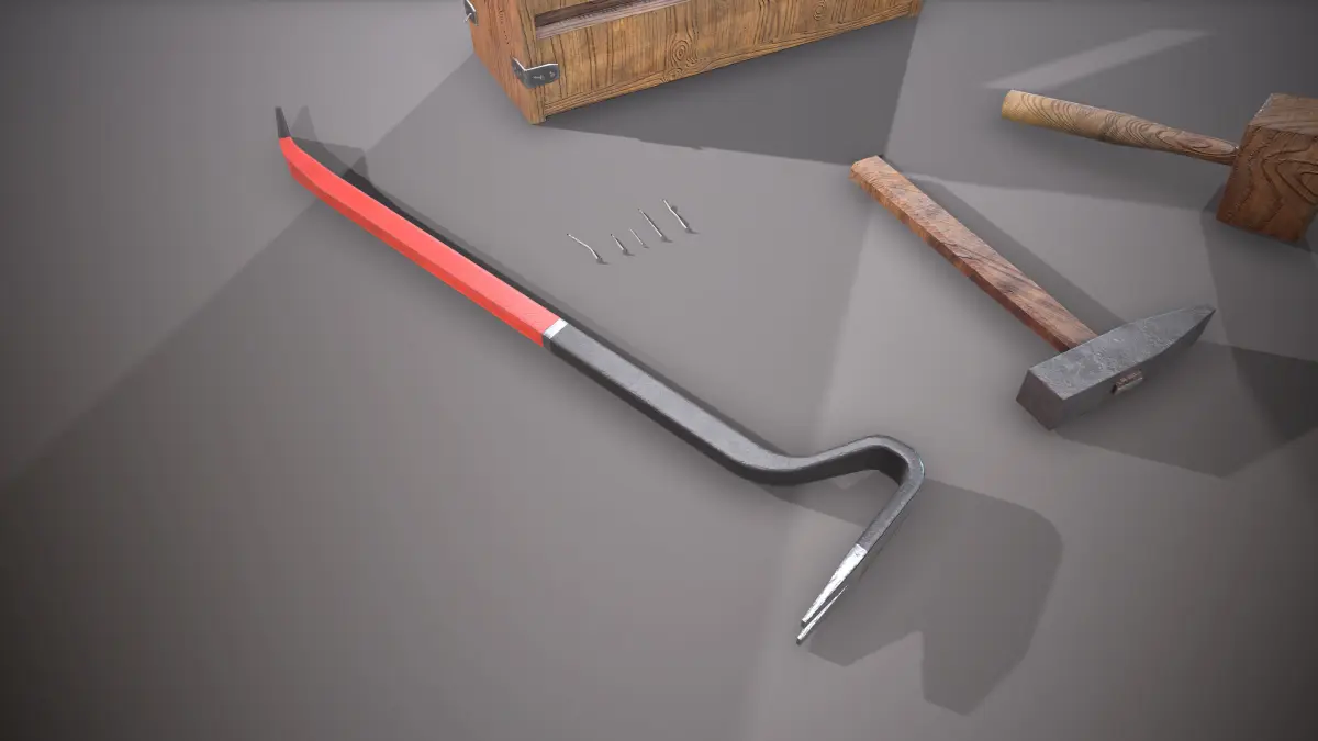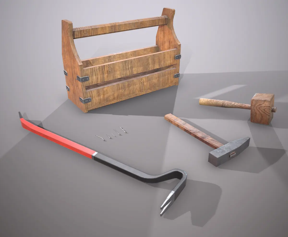 Wooden toolbox, hammer, mallet, clipper nail, 5 nails. Gameready prop 3d model for game or other project with pbr mapslow-poly 3d model ready for Virtual Reality (VR), Augmented Reality (AR), games and other real-time apps.