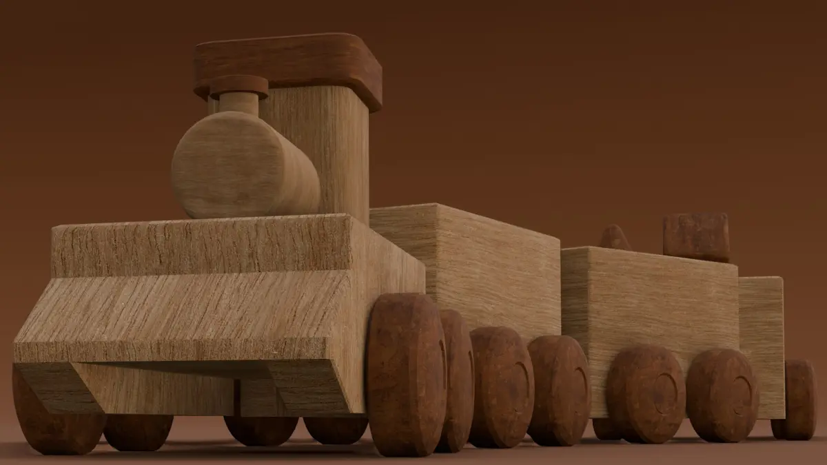 Textures: The model features high-quality textures that enhance its visual detail, emphasizing the natural grain and color variations typical of wooden surfaces. These textures simulate the tactile quality of wood, adding depth and realism to the model.Materials: Various materials have been applied to accurately replicate the surface properties of wood, including its reflective qualities and the subtle roughness that gives the wooden train its authentic appearance. The materials are designed to interact realistically with light, ensuring the model looks convincing under different lighting conditions.Animation and Rigging: