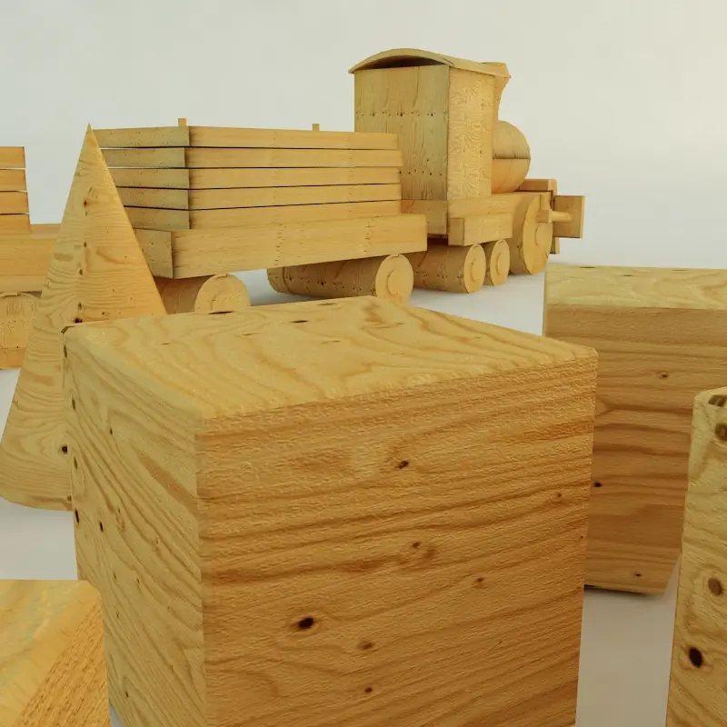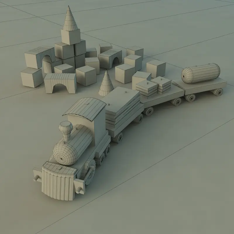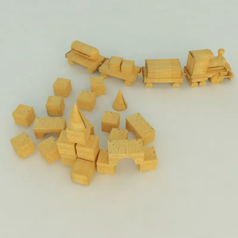 Child-wood train toy that fits into any nursery. Part of her model are cubes. The model was modeled in 3dsmax 2012 and v-ray render 2.0