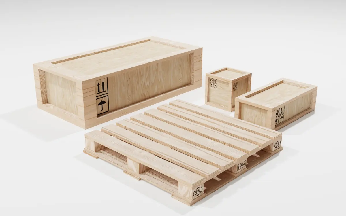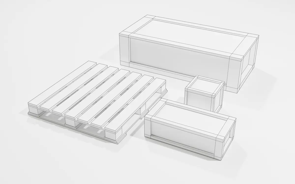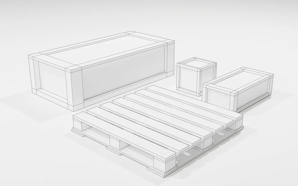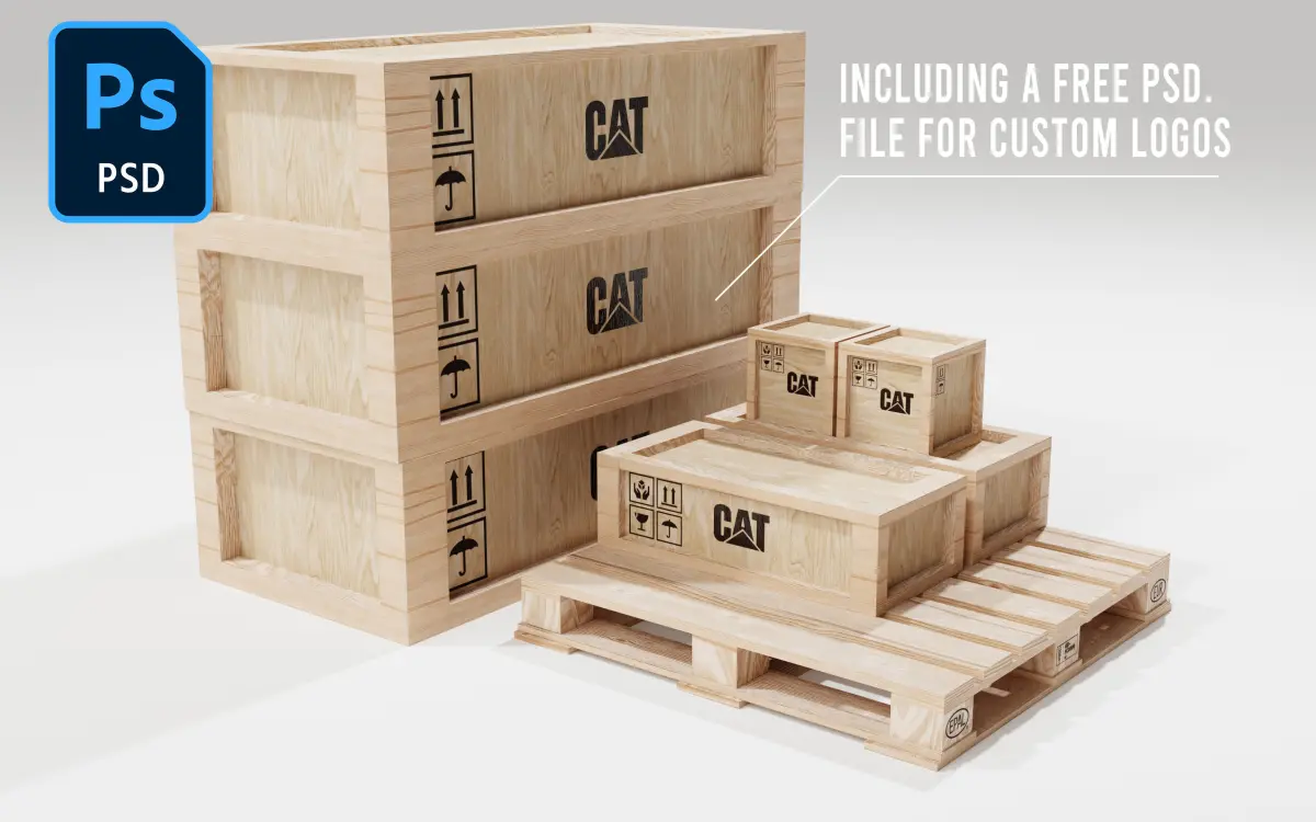 3D model of Generic wooden boxes and a pallet wich can be used for transport. The model has been made in blender and is very low poly with only 384 polygons. Custom logo's can be added with the psd. file.