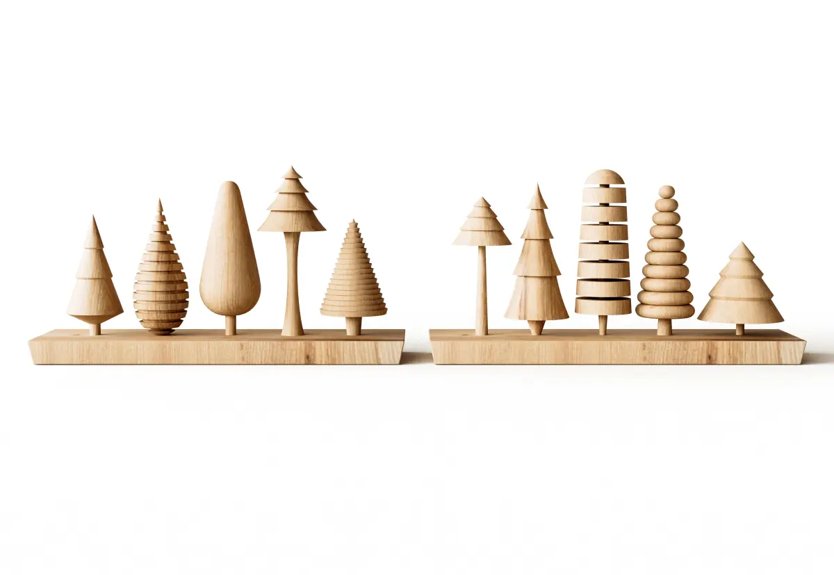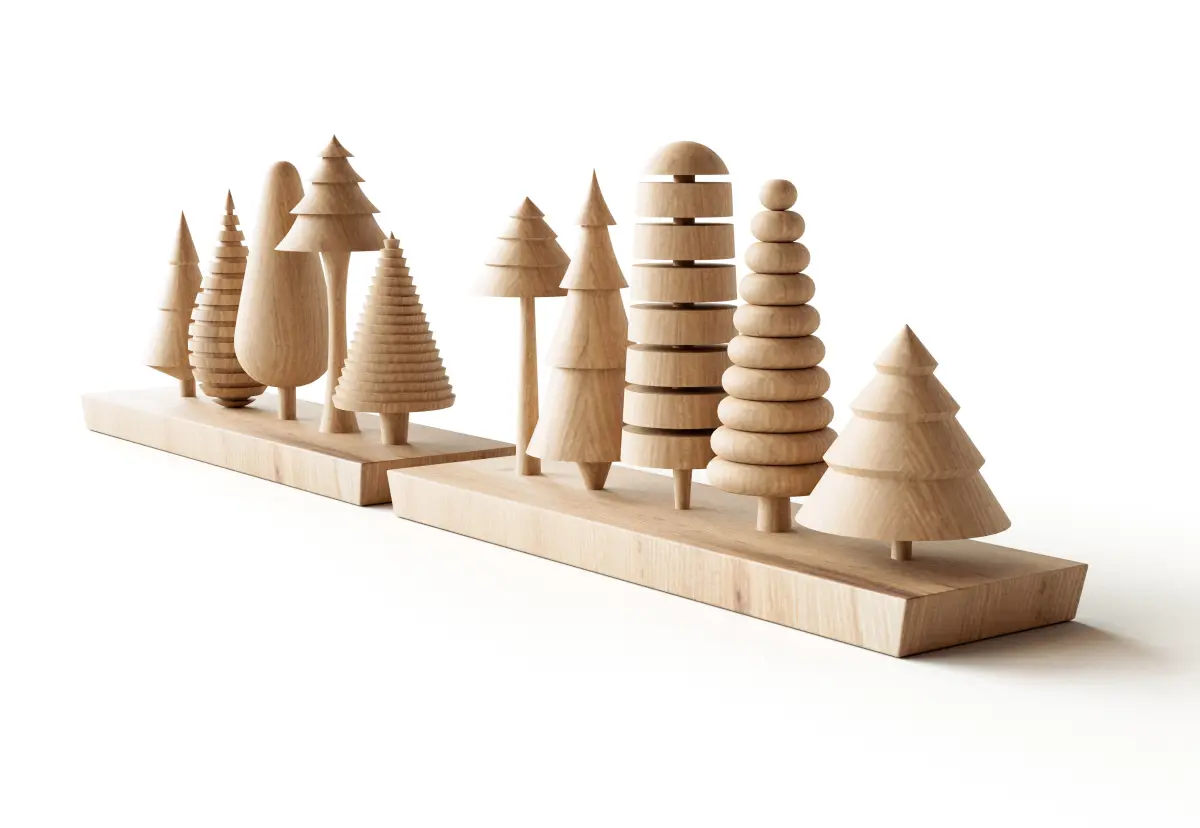 A collection of various shaped wooden pine christmas tree shelf decorationsCreated natively in Cinema 4D using splines lathe nurbs they can be adjusted in Cinema 4D accordingly.Contains procedural and parametrized meshes which may translate to higher poly count than stipulated if converted to other formats.