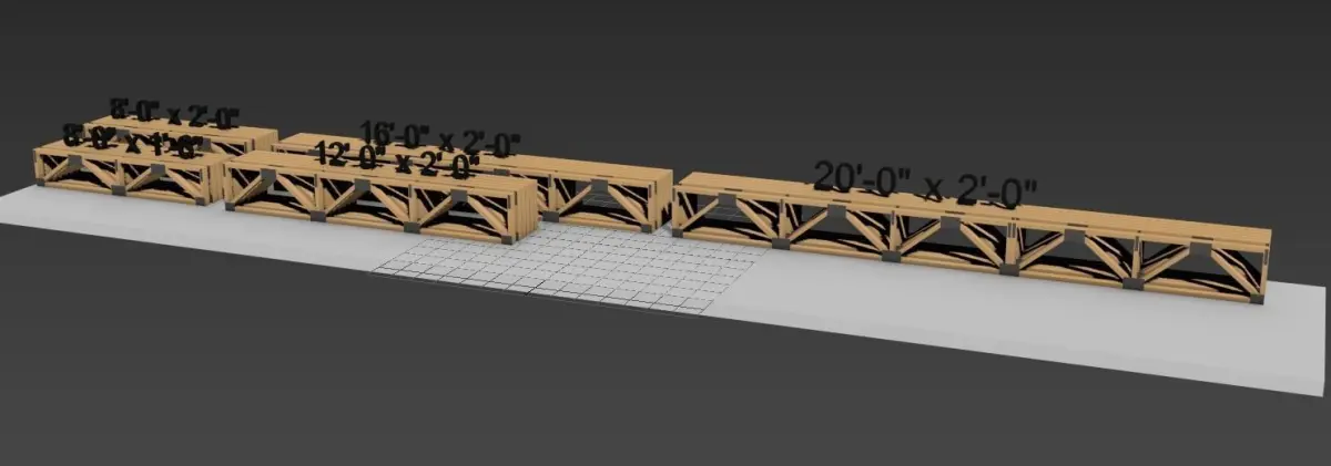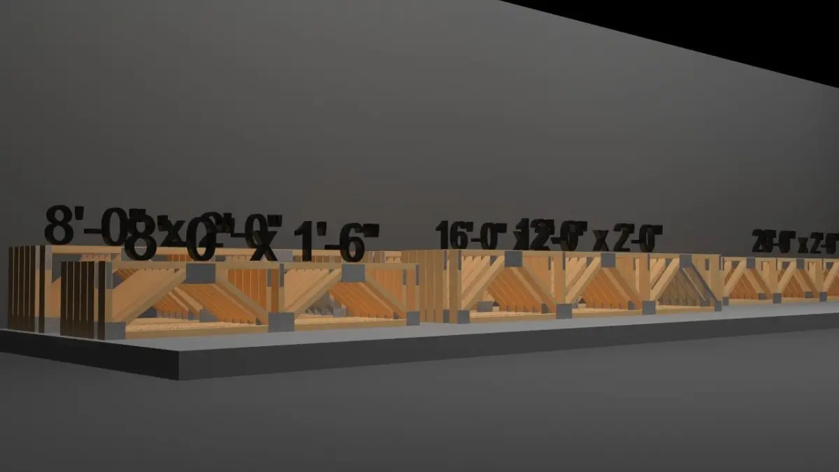 Various standard sized wooden trusses (Warren Style) Each size comes ready with individual and 5 count (shipping) package groupsgroups can be broken up and have indivdual trusses. NOMINAL SIZE LUMBER: 2X4XLSAW CUT (ACTUAL SIZE) (as drawn) 1.75 X 3.5X LCONNECTOR PLATES (METAL MESHPLATES) Truss Sizes of the preformed models - 8'-0L x 1'-6H /- 8'-0L x 2'-0H /- 12'-0L X 2'-0H /- 16'-0L X 2'-0H /- 20'-0L X 2'-0"H(BASED ON PINE TRUSSES)NOTE: TRUSS PLATES HAVE NAIL HOLES WHICH INCREASES POLY & VERT COUNTS