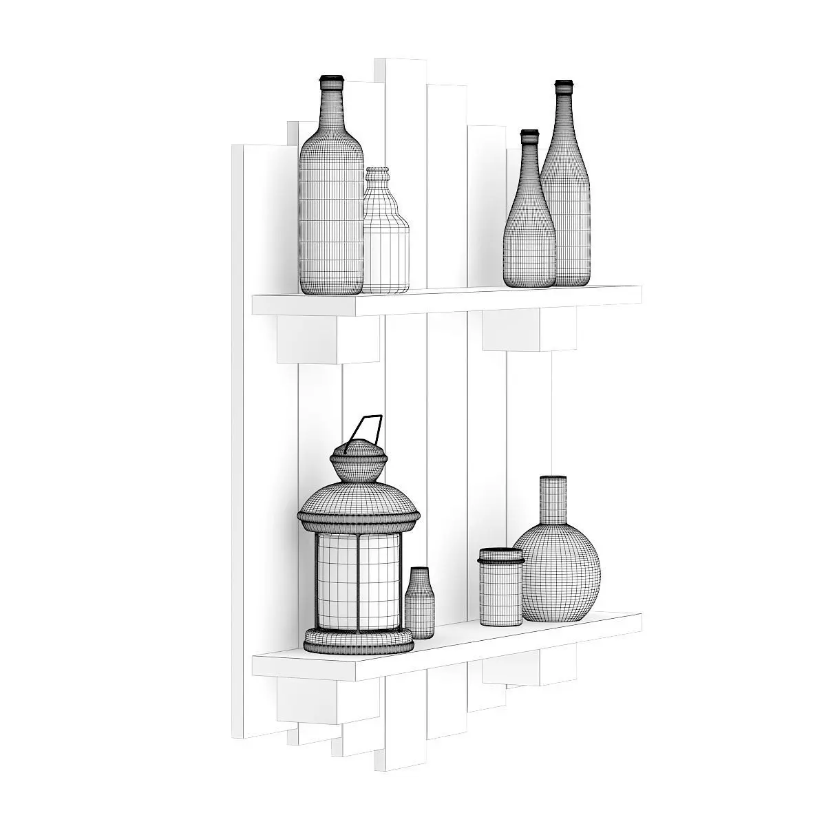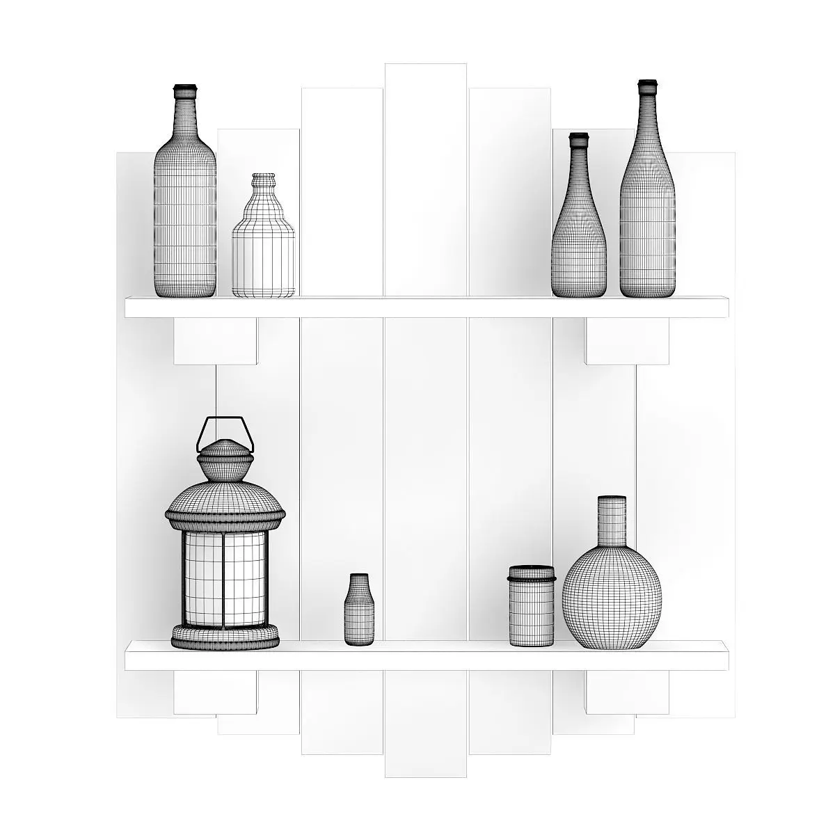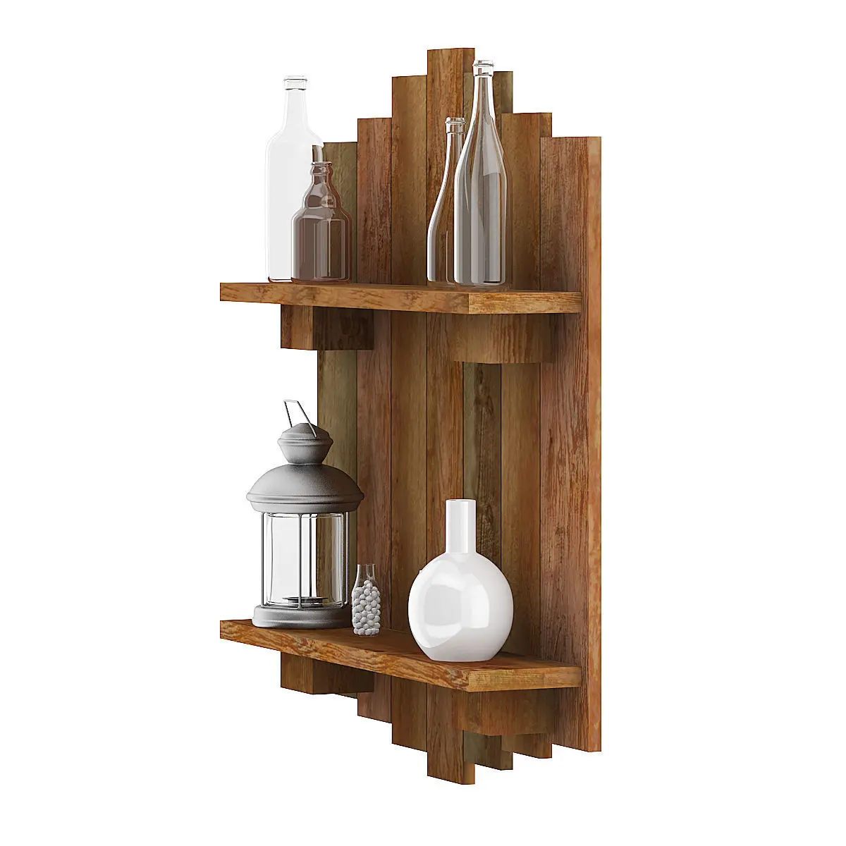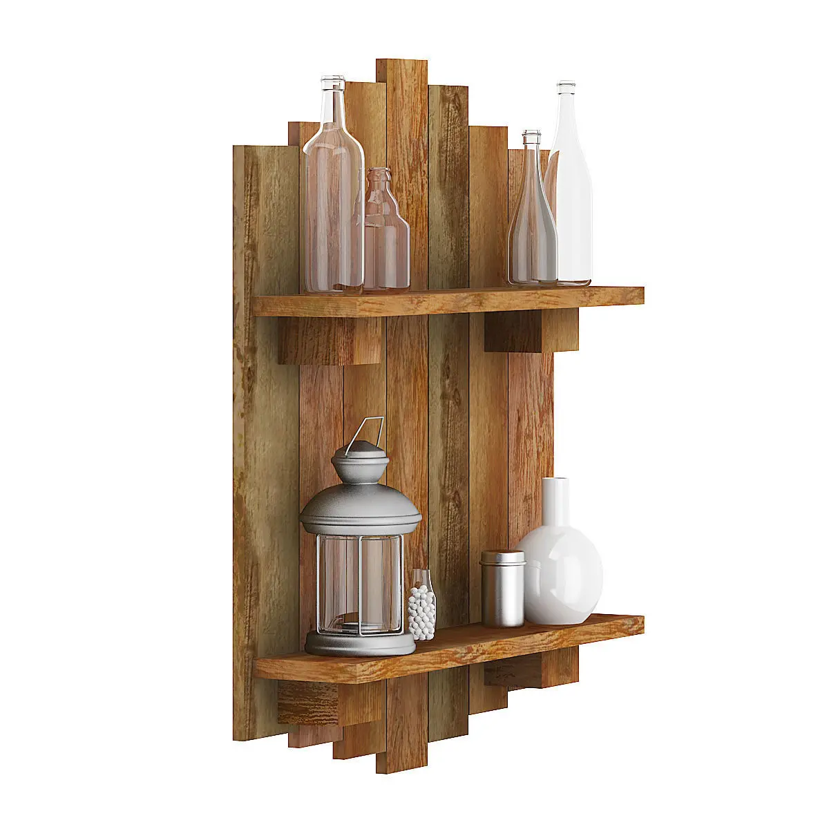 3d model of rough wall decoration made of used wooden planks. It has black metallic lantern round metal container and several glass bottles placed on it. Compatible with 3ds max 2010 or higher and many others.