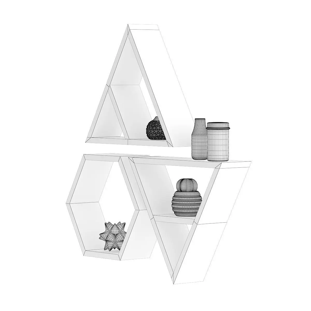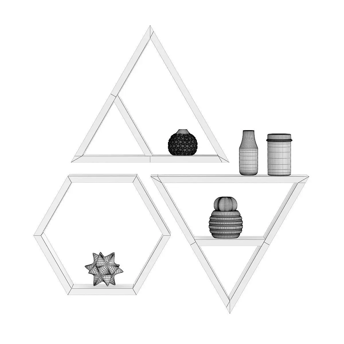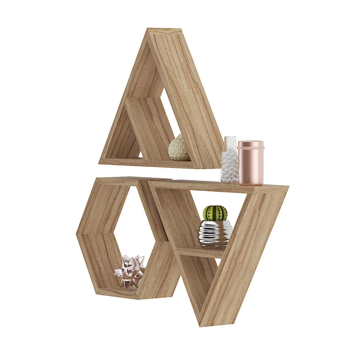 3d model of wooden wall shelf: two triangles and one hexagonal. They have some decorations and a cactus plant placed on them. Compatible with 3ds max 2010 or higher and many others.