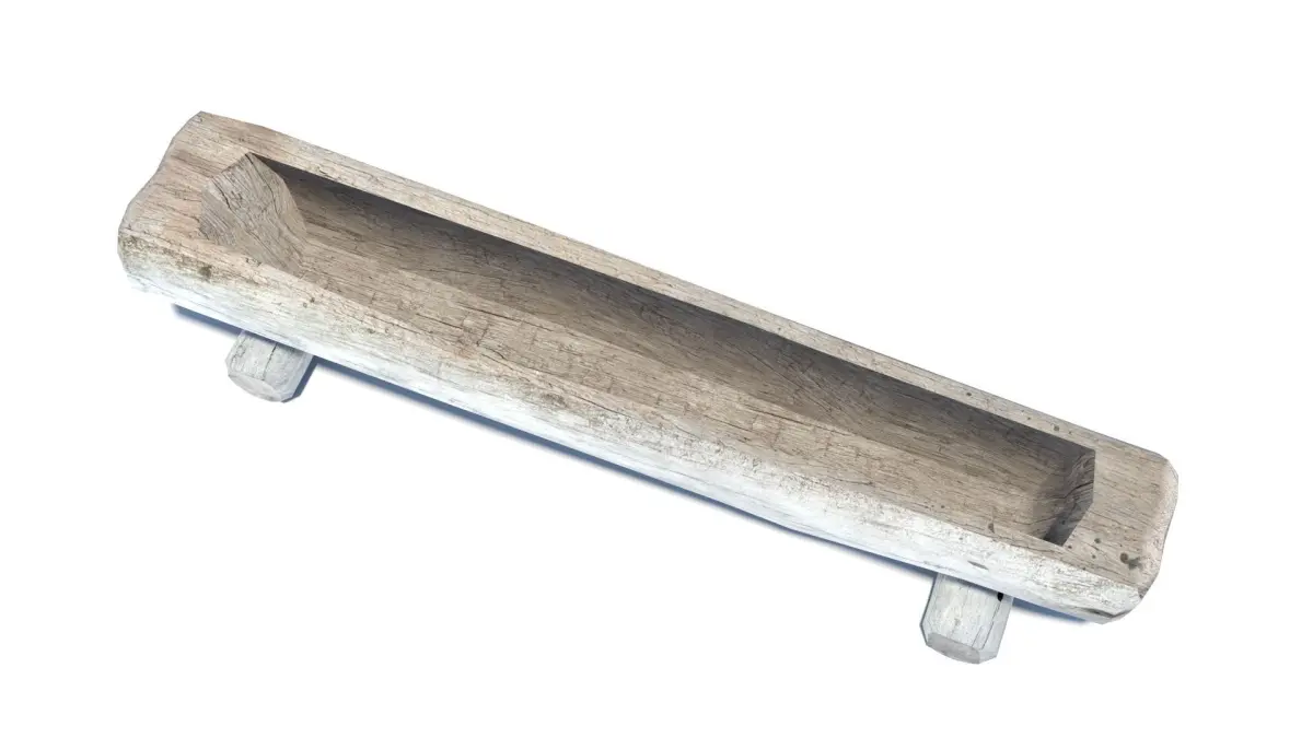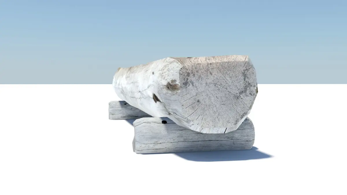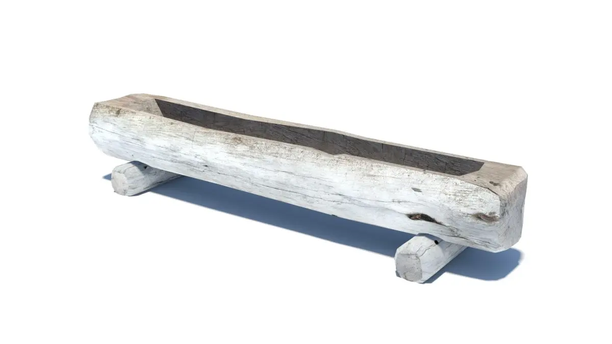 Low-poly trough, carved or rather hacked from a single piece of fir or larch tree trunk. It is resting on two shorter stumps. Troughs like this are very easy to make and were therefore already used in early times for holding food or water for cattle and man. They are still in use in the Alps and other regions in Europe and around the world.