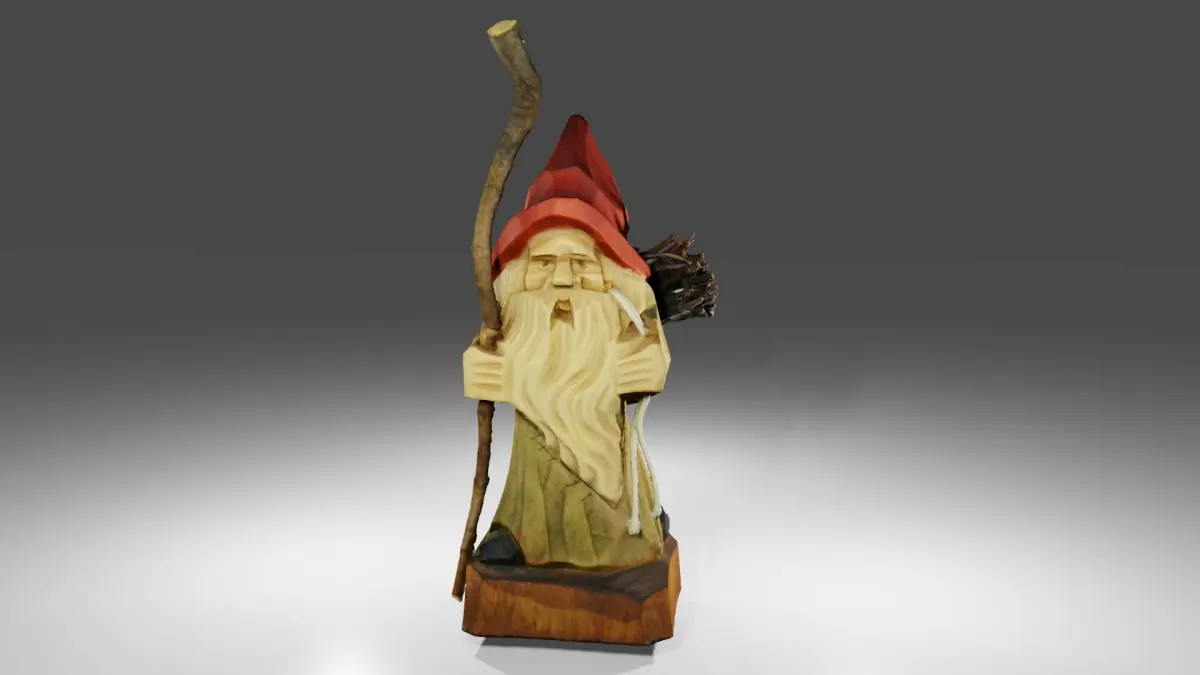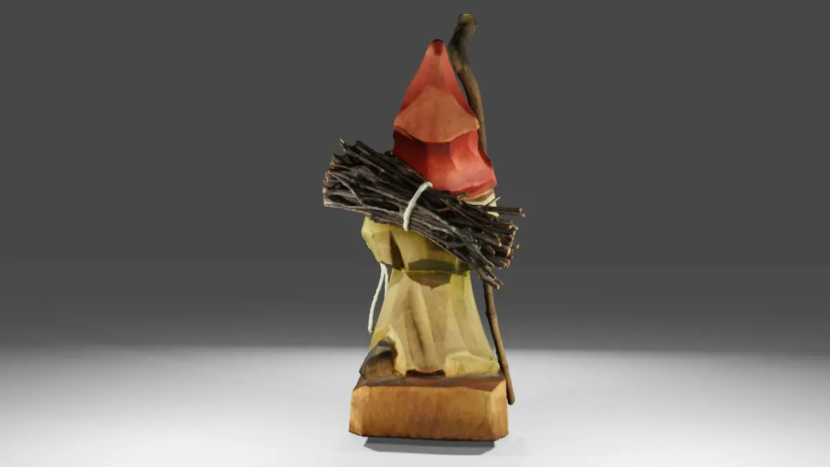 This traditional, antique-style wooden statuette is from the south of Poland, crafted by hand in the typical Tatra style.It's about 5 inches tall, and has a wizard in a tall wizarding hat carrying a bundle of sticks and a staff. It is on a small base and is a full 360 degree scan with underside included