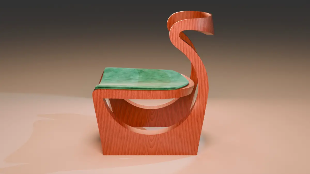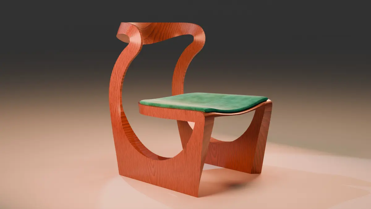This 3D model represents an elegant modern chair with a unique and sophisticated design. Its frame is made of wood with a detailed finish that mimics natural grain, providing a realistic and high-quality appearance.